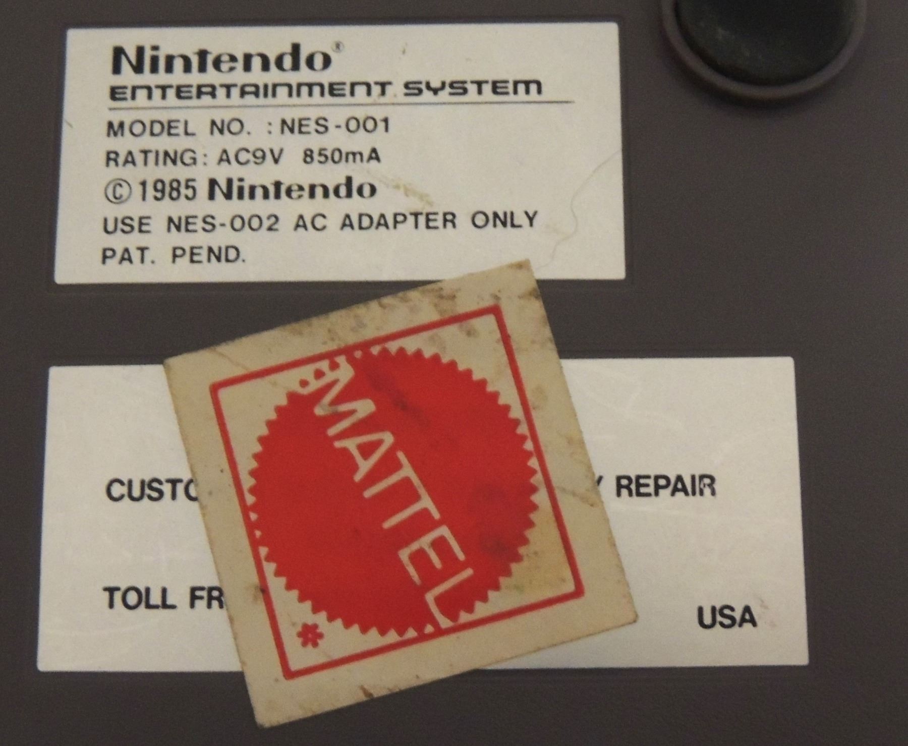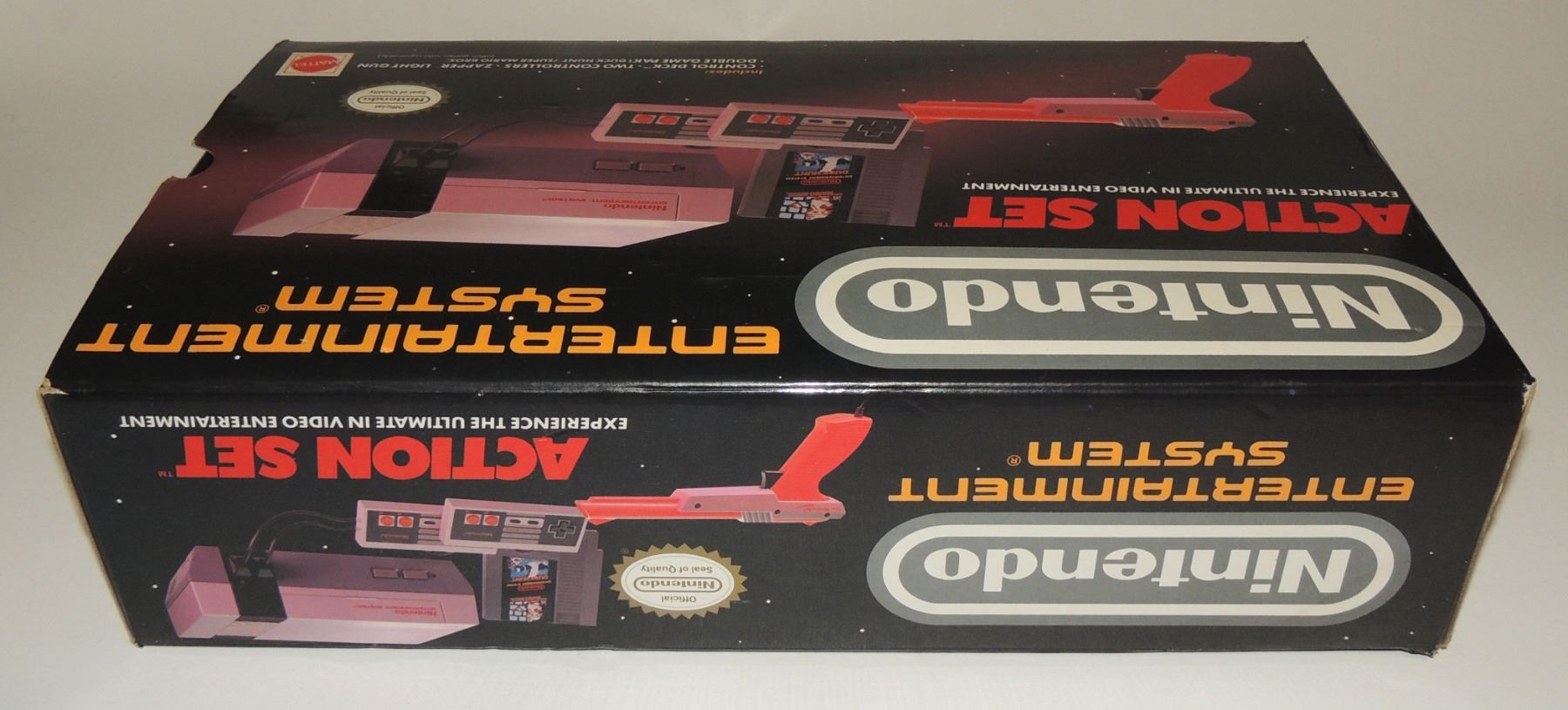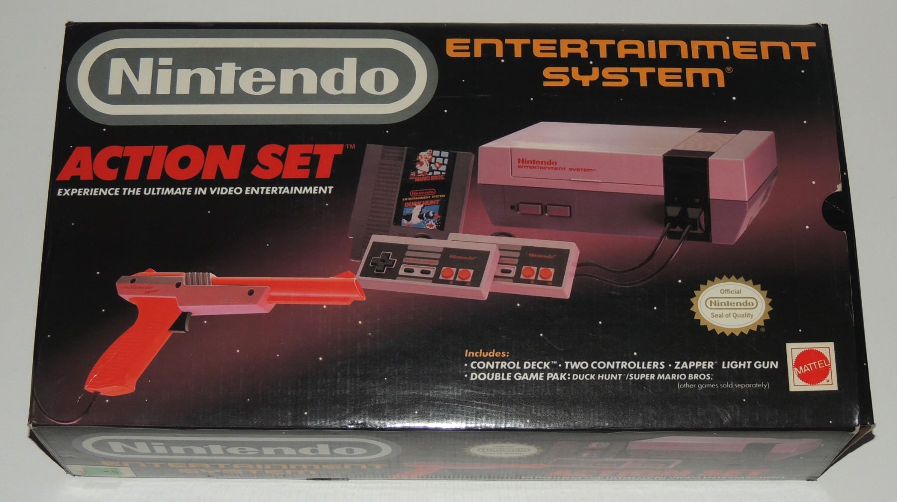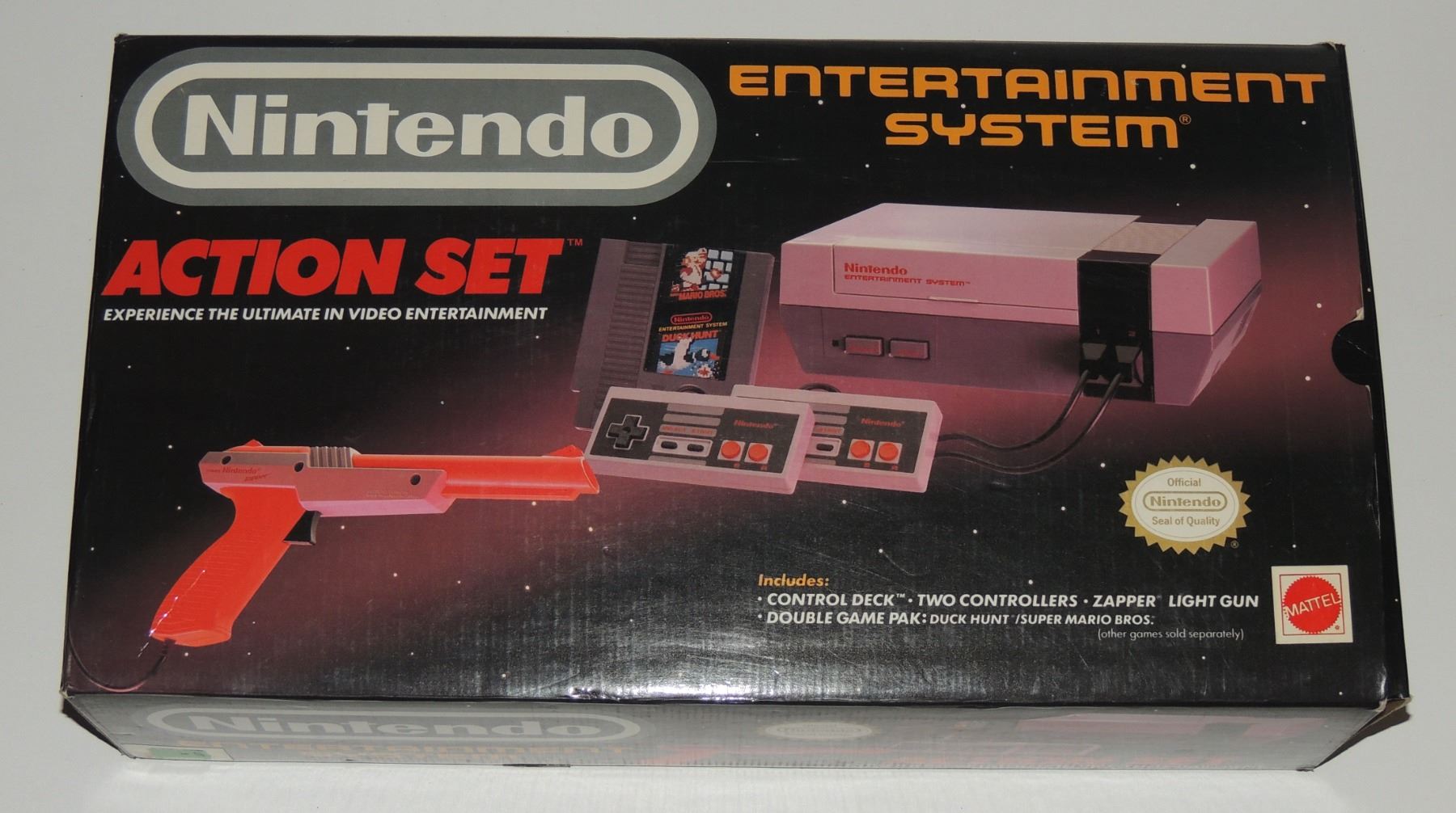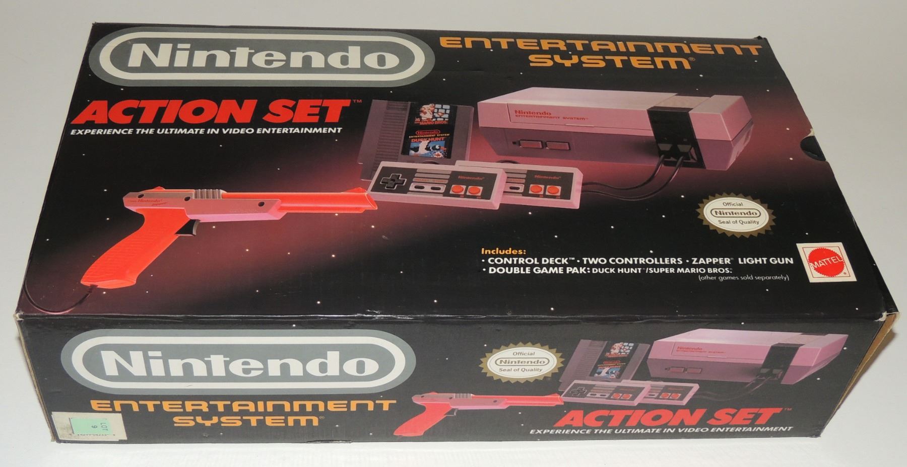 Complete in Box CIB System Tested & Working! Includes all cords (modified power cord), zapper gun, two controllers, Super Mario Brothers / Duck Hunt, Manuals, Bags and more. Recommended further/ Continuious cleaning of 72 pin connector or replacement for optimum fuction. Mattel Canadian Sticker Variation Box
