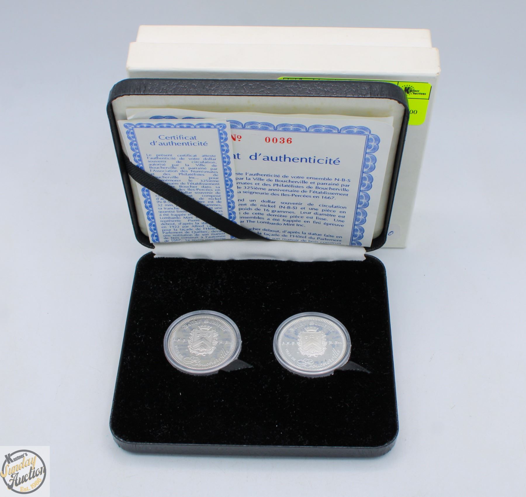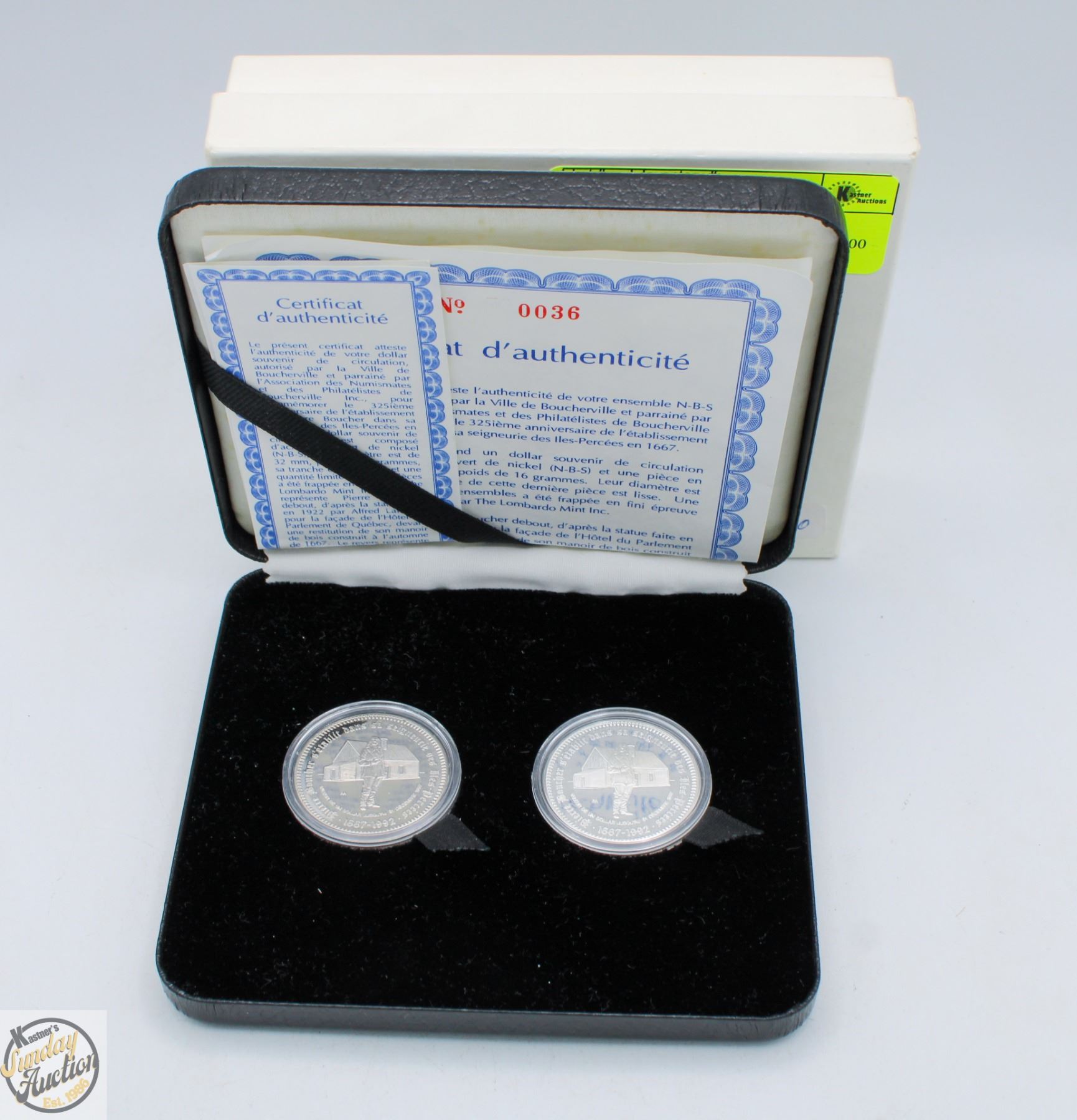 OF THE 325TH ANNIVERSARY OF PIERRE BOUCHERS ESTABLISHMENT IN SEIGNEURY OF ILES PERCEES IN 1667199. ONE COIN IS MADE OF .999 SILVER THE OTHER IS MADE OF NICKEL PLATED STEEL.