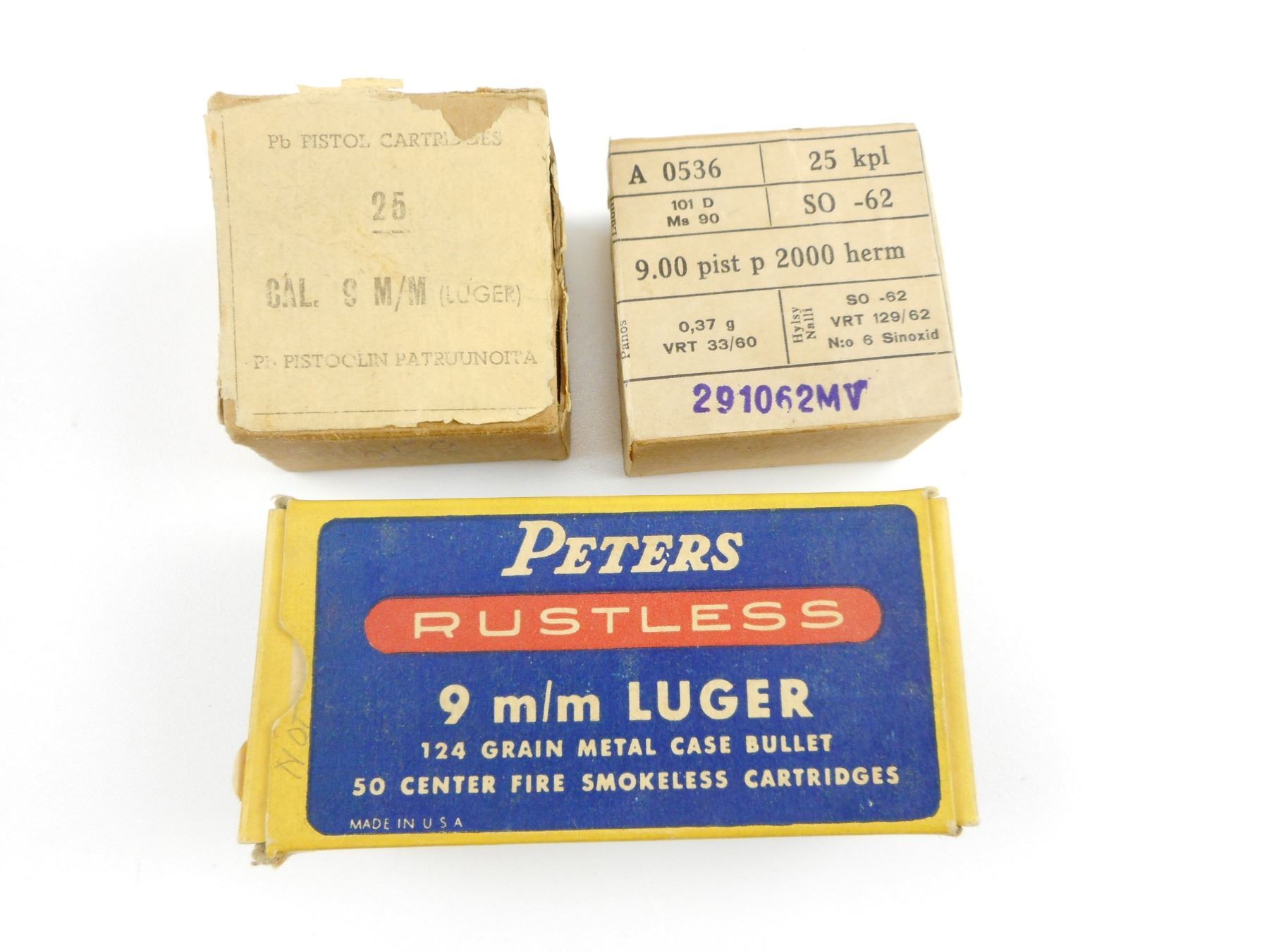 9MM ASSORTED AMMO , 62 RNDS 9MM ASSORTED AMMO, IN VINTAGE BOXES, 2 BOXES OF FINNISH AND 1 PETERS