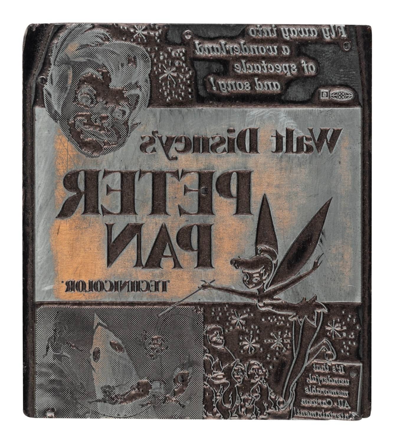 (Disney, 1969) A printing block of an advertisement for the 1969 theatrical re-release of "Peter Pan." Measuring 2.75" x 3.25" x 1", the printing block is in good, production-used condition with typical ink stains throughout and tears to the paper on the top side.