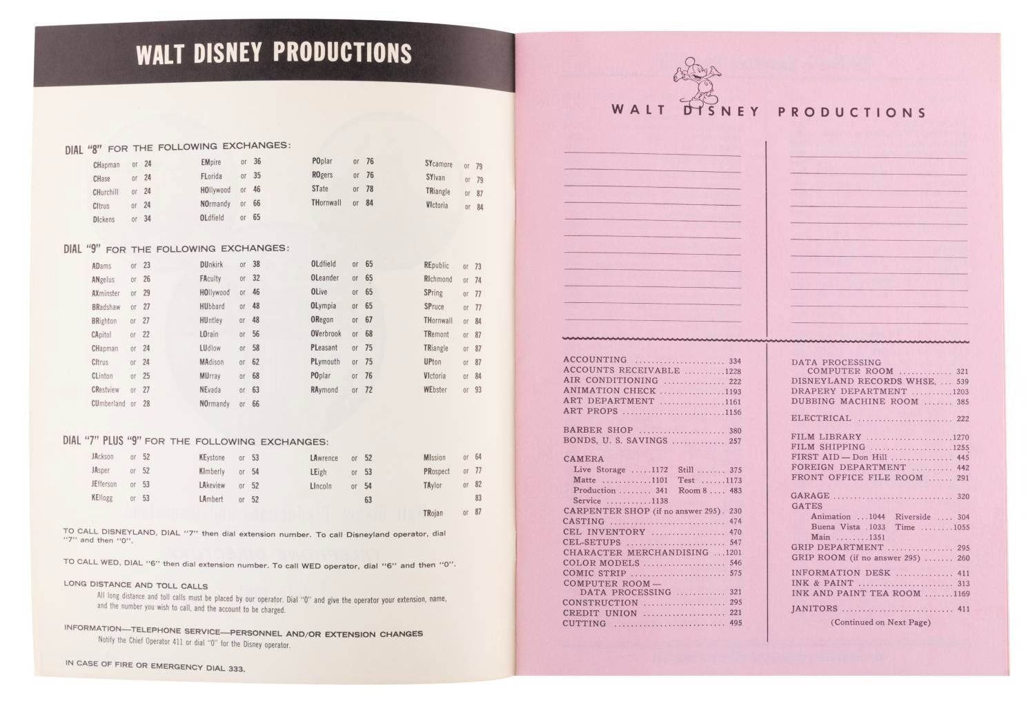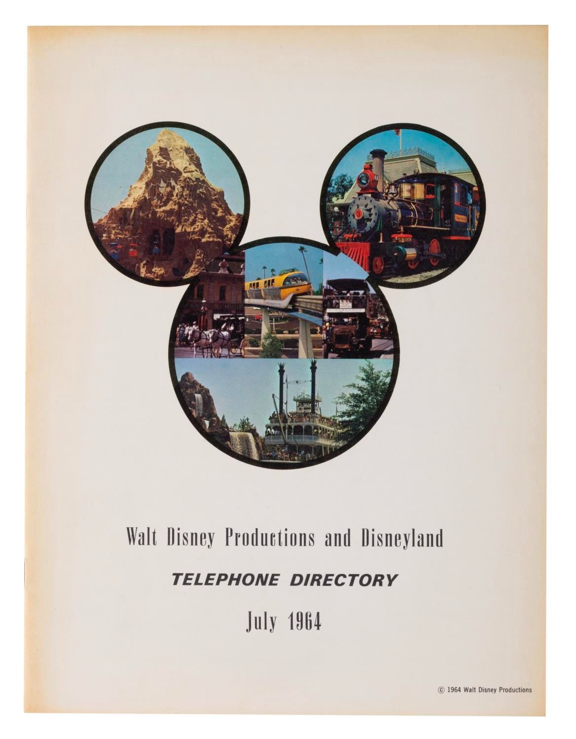 (Disney, 1964) A July 1964 Walt Disney Productions and Disneyland telephone directory with pages listing employee phone numbers, department services, lessees, exhibitors, and contractors, with general information about dialing. Notable contacts included in the directory are Ward Kimball, Roger Broggie, and Walt Disney himself. Measuring 8.5" x 11", the 16-page directory is in good condition with edge wear, smudges, and discoloration throughout.