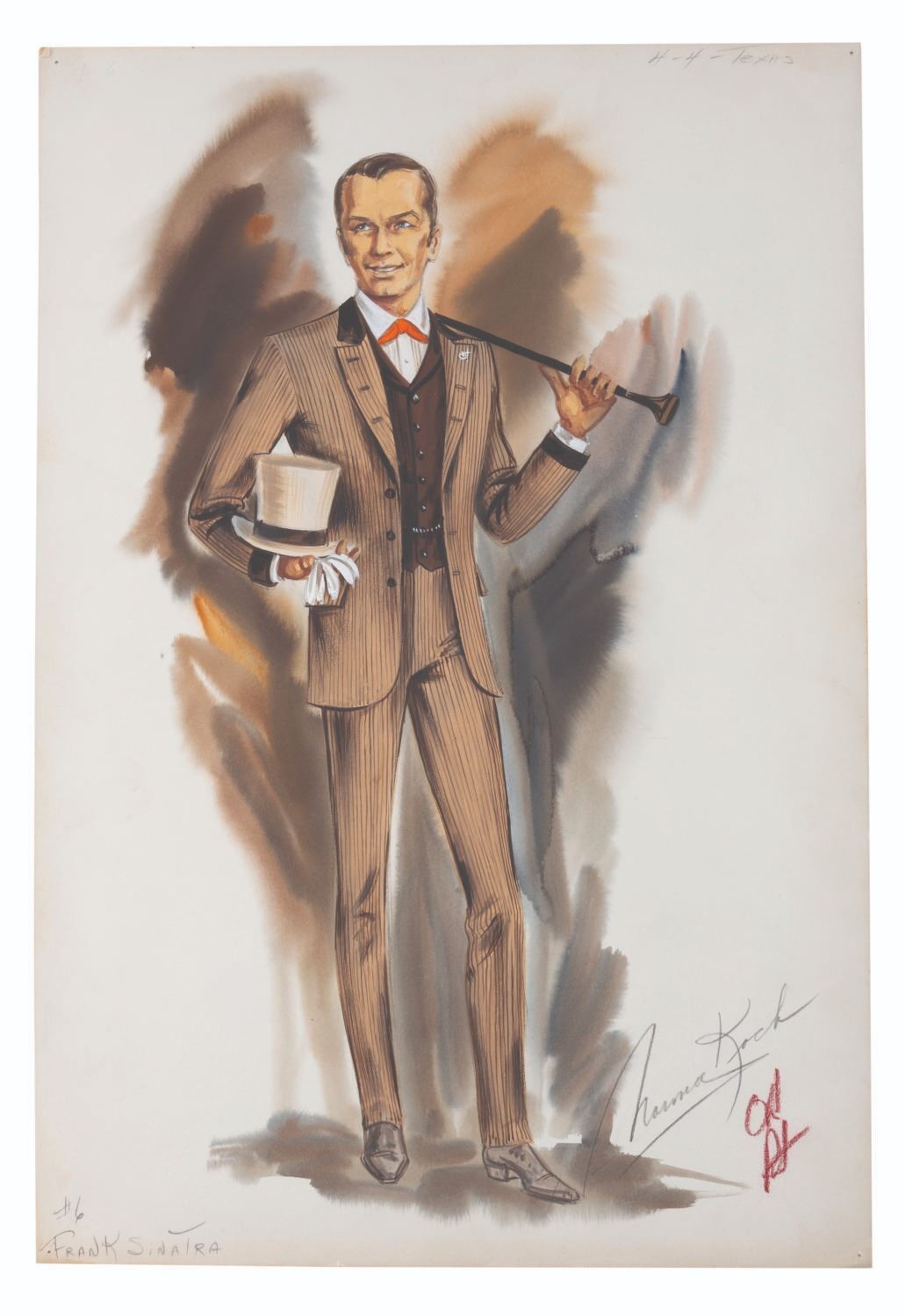 (Warner Bros., 1963) A costume design for Frank Sinatra in the Western comedy "4 for Texas.” The dapper striped suit was designed by Oscar-winning costume designer Norma Koch and signed in graphite at the bottom right. Accomplished in graphite, marker, and paint on artist board, the 15” x 22” design displays in very good condition with light creases, edge wear, discoloration from age, and pinholes at the corners from production use.