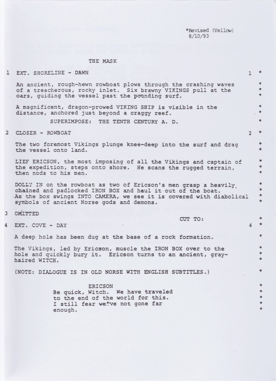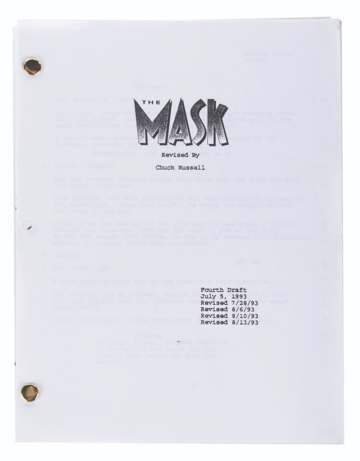 (New Line Cinema, 1993) An original 4th draft production script from "The Mask,” revised by Chuck Russell and dated August 13, 1993. This is a post-production photocopy printed for use at Industrial Light & Magic. Measuring 8.5” x 11” and 0.5” thick, the 116-page script is in good condition with light edge wear and creasing.