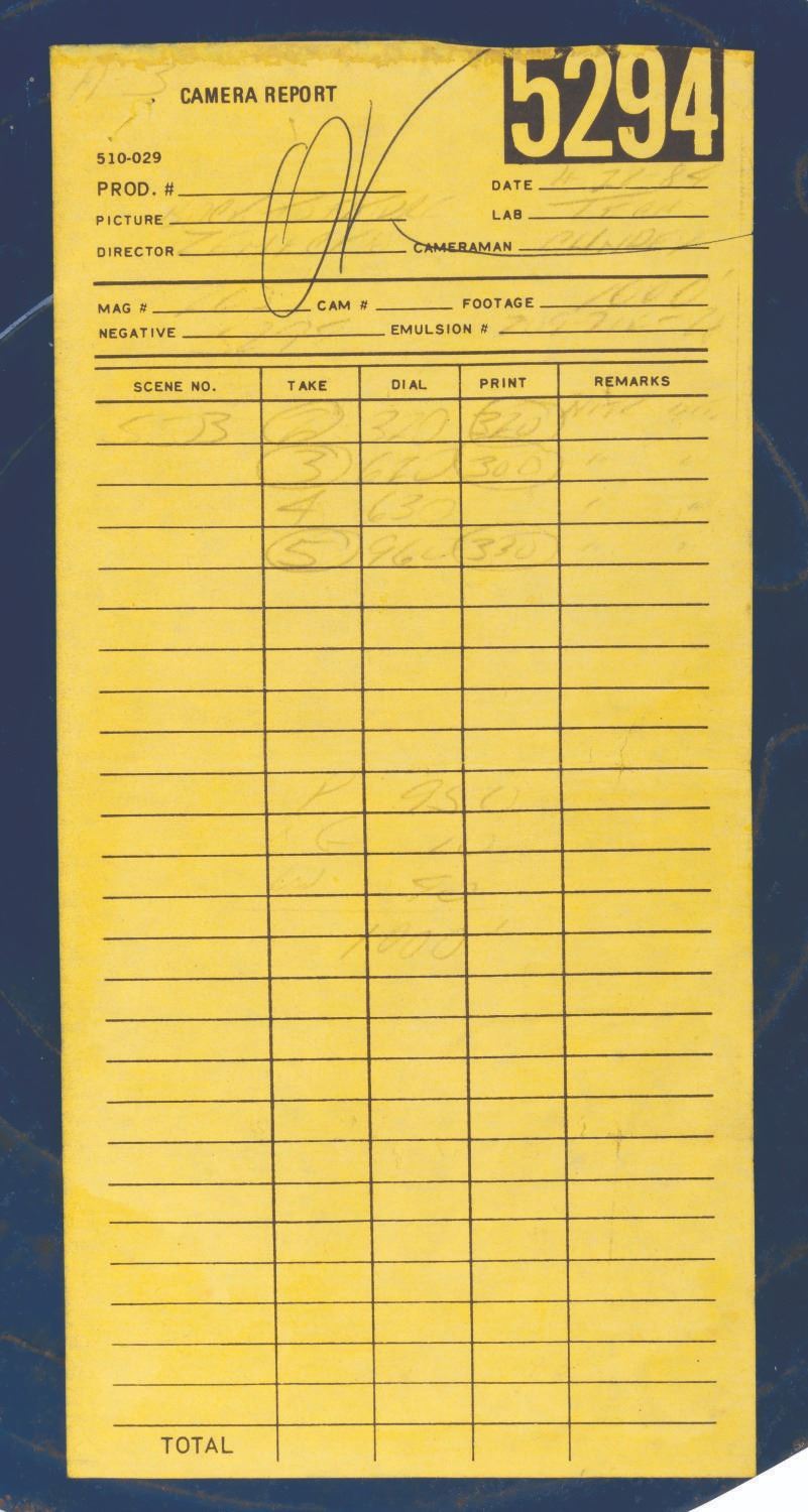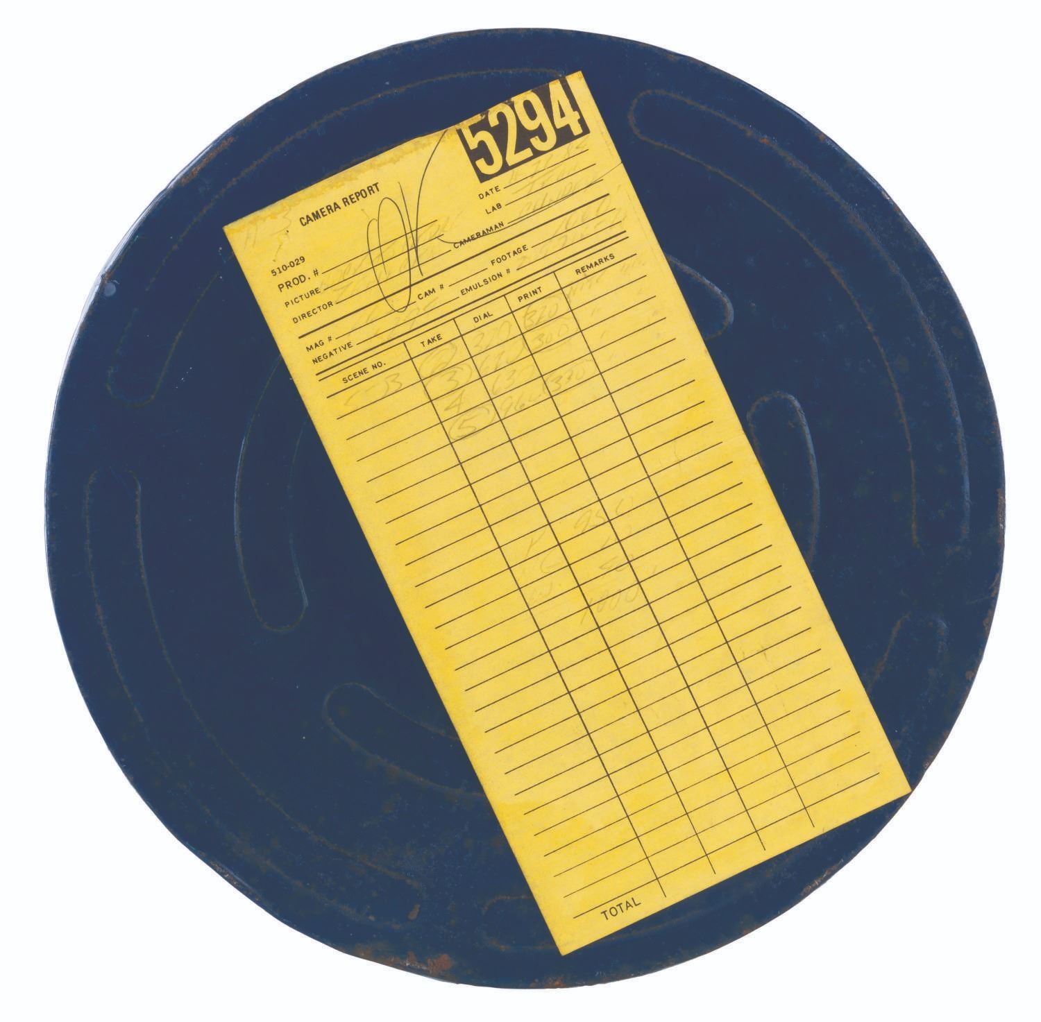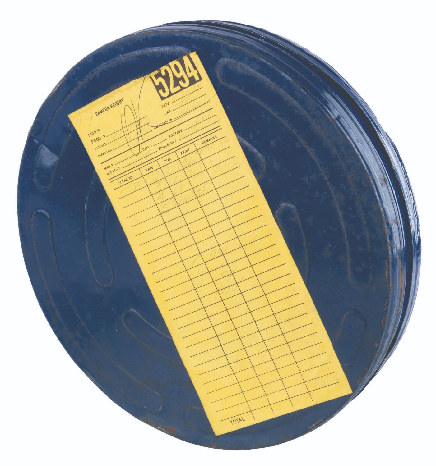 (Universal, 1985) A "Back to the Future” production-used film canister with attached camera reports dated "11-28-85," on two sheets of carbonless copy paper. Measuring 10.5” in diameter and 1.75" tall, the canister is in fair condition with dents, paint loss, scratches, and oxidation.