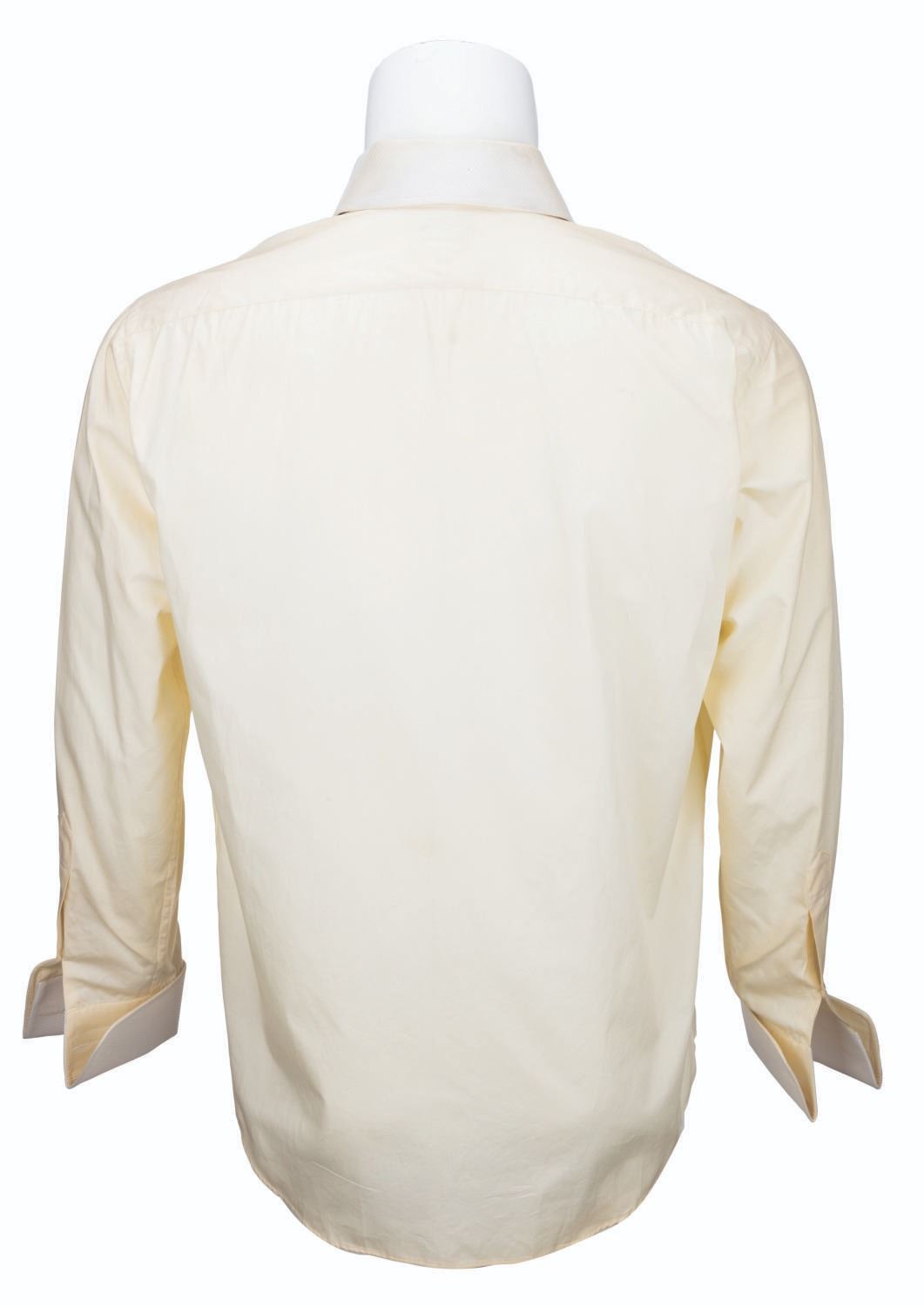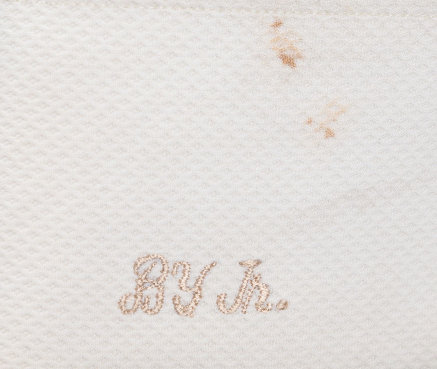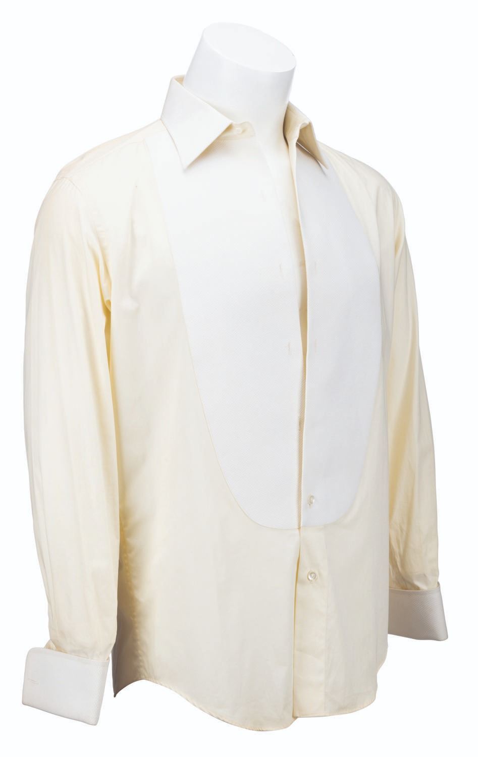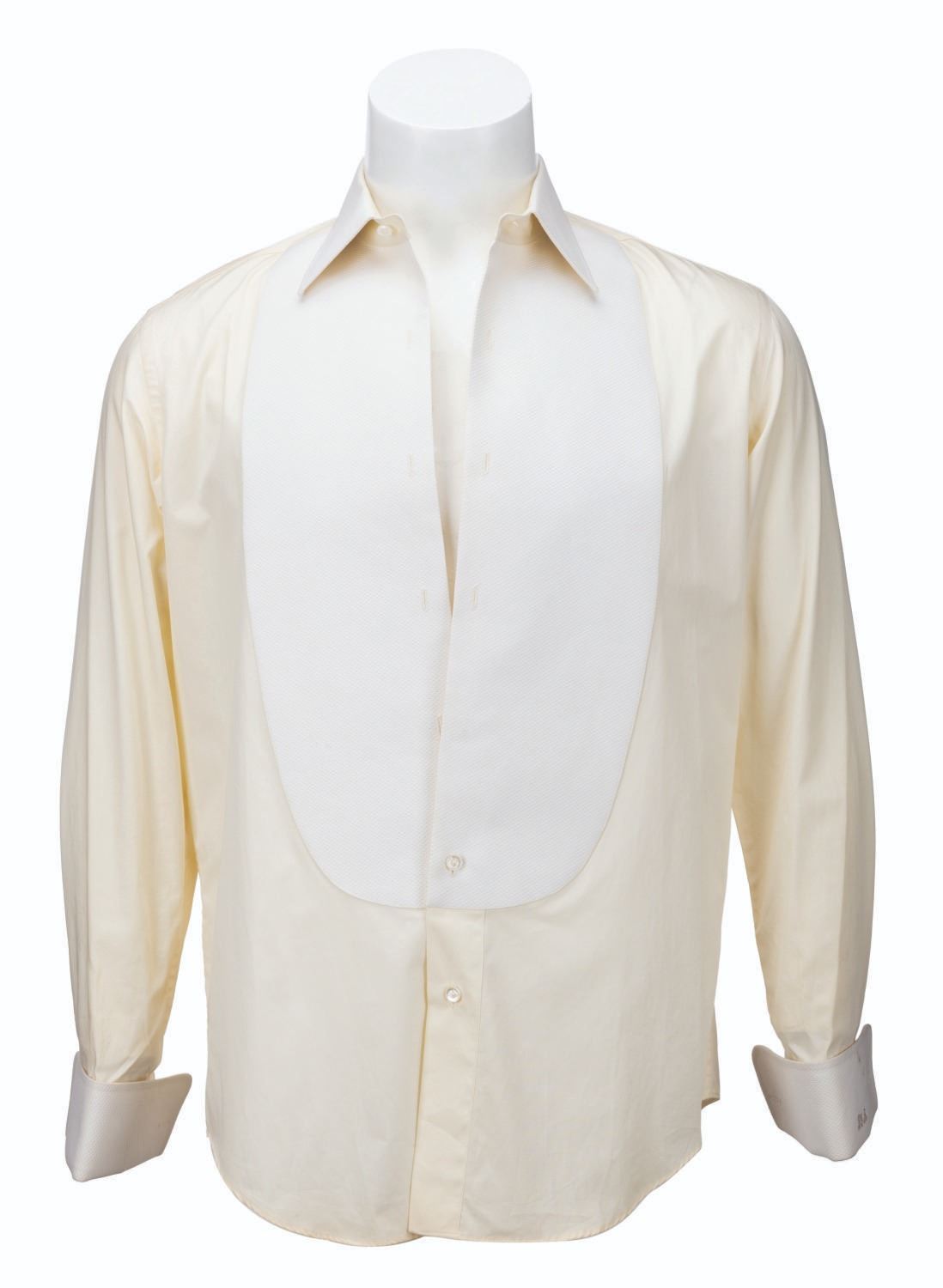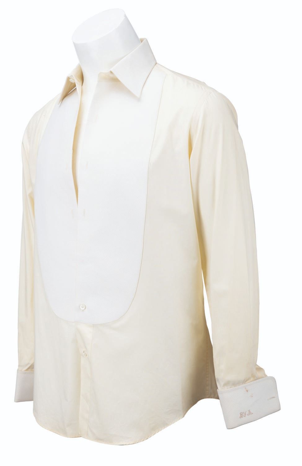 (Columbia, 1991) A screen-used costume tuxedo shirt worn by Billy Crystal as Buddy Young Jr. in "Mr. Saturday Night,” embroidered with "BY Jr.” on the left French-style cuff. The shirt is unlabeled but appears to be a size M, and has a tag dated Nov. 1991 with Crystal’s initials. The piece is in good production-used condition with staining and soiling around the cuffs, collar, and discoloration.
