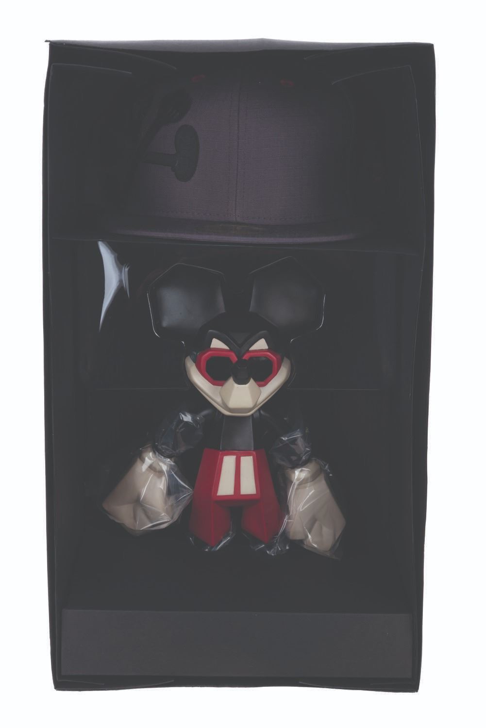 (Span of Sunset, 2008) A Mickey Mouse articulated vinyl figure and New Era fitted hat set. The set designed by James T. Quinn III was created as part of Disney's Bloc28 initiative, which commissioned emerging talents from the street art scene to create original pieces featuring classic Disney characters. The figure measures 10.25" tall and the hat is labeled a size 7 ⅝", both housed in the 10" x 7" x 17.25" tall original box. The set is in fine condition with light wear to the box.