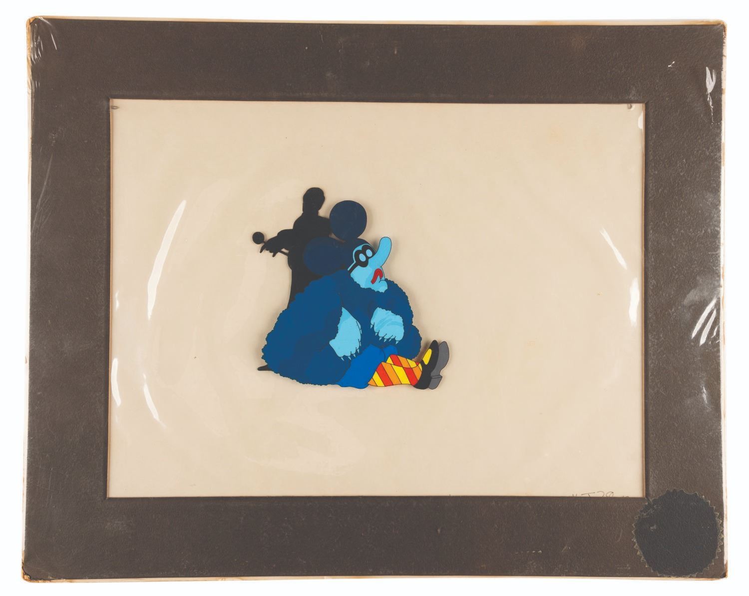 (United Artists, 1968) An original hand-painted production cel of a Blue Meanie from "Yellow Submarine.” With a character image size measuring 5.75” x 5.5” on an 11.25” x 15.25” visible cel in a 16” x 20” matte, the cel, sealed in its original retail wrapping displays in very good condition with light warping and staples in the top corners which do not affect the image.