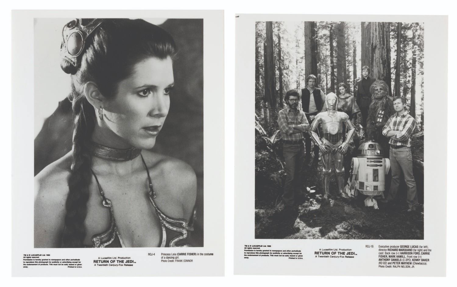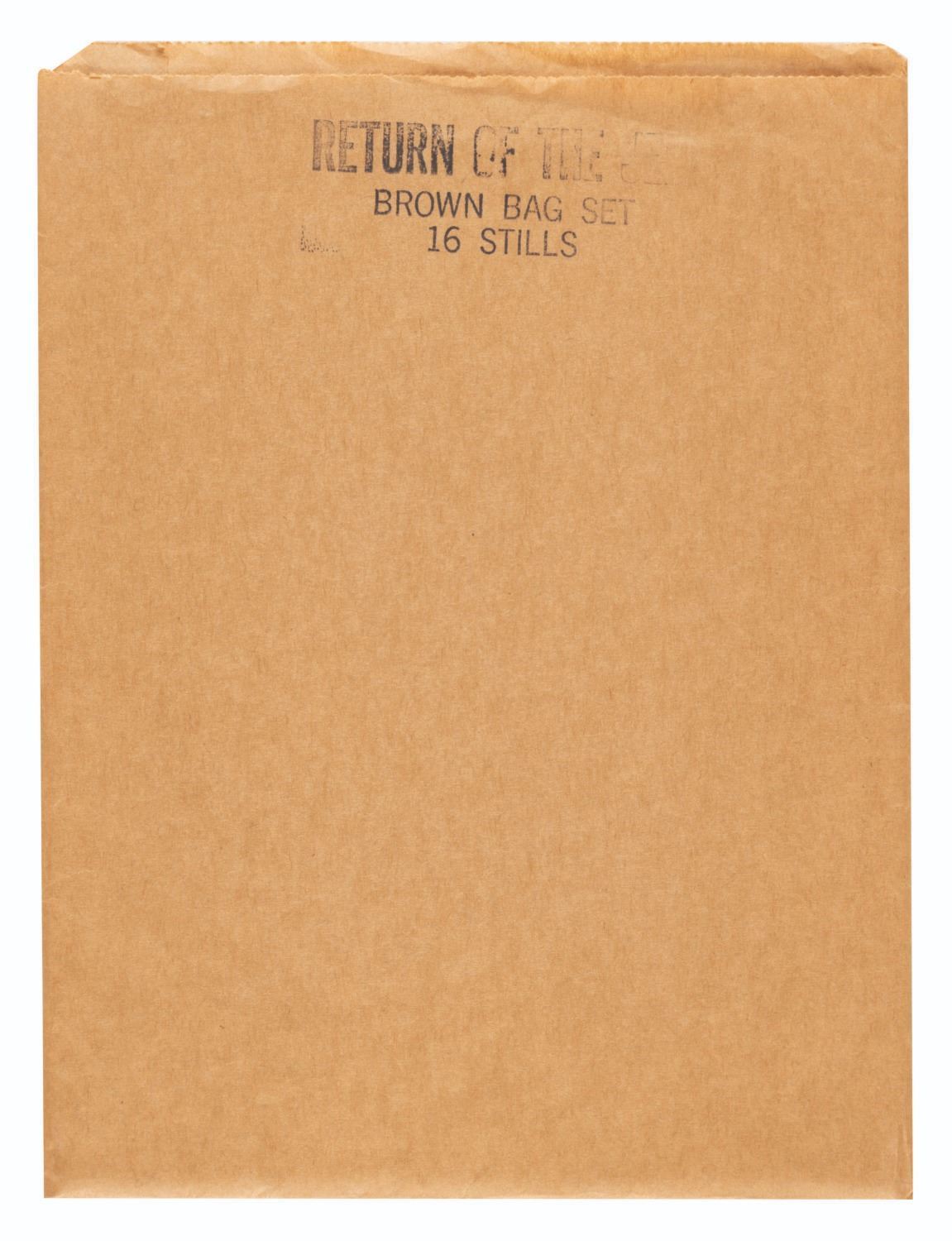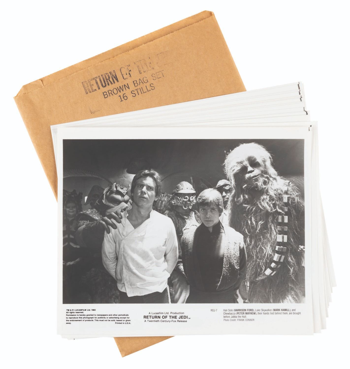 (20th Century Fox, 1983) A set of 16 publicity photos from "Return of the Jedi" with the original bag. The photos feature "Slave” Leia, Chewbacca, Lando Calrissian, Luke Skywalker and Han Solo in camouflage on Endor, and more. Measuring 8” x 10” each, the glossy photos are in fine condition. The original 8.5” x 11.25” brown paper bag is stamped "Return of the Jedi" and in very good condition with light creasing near the top.