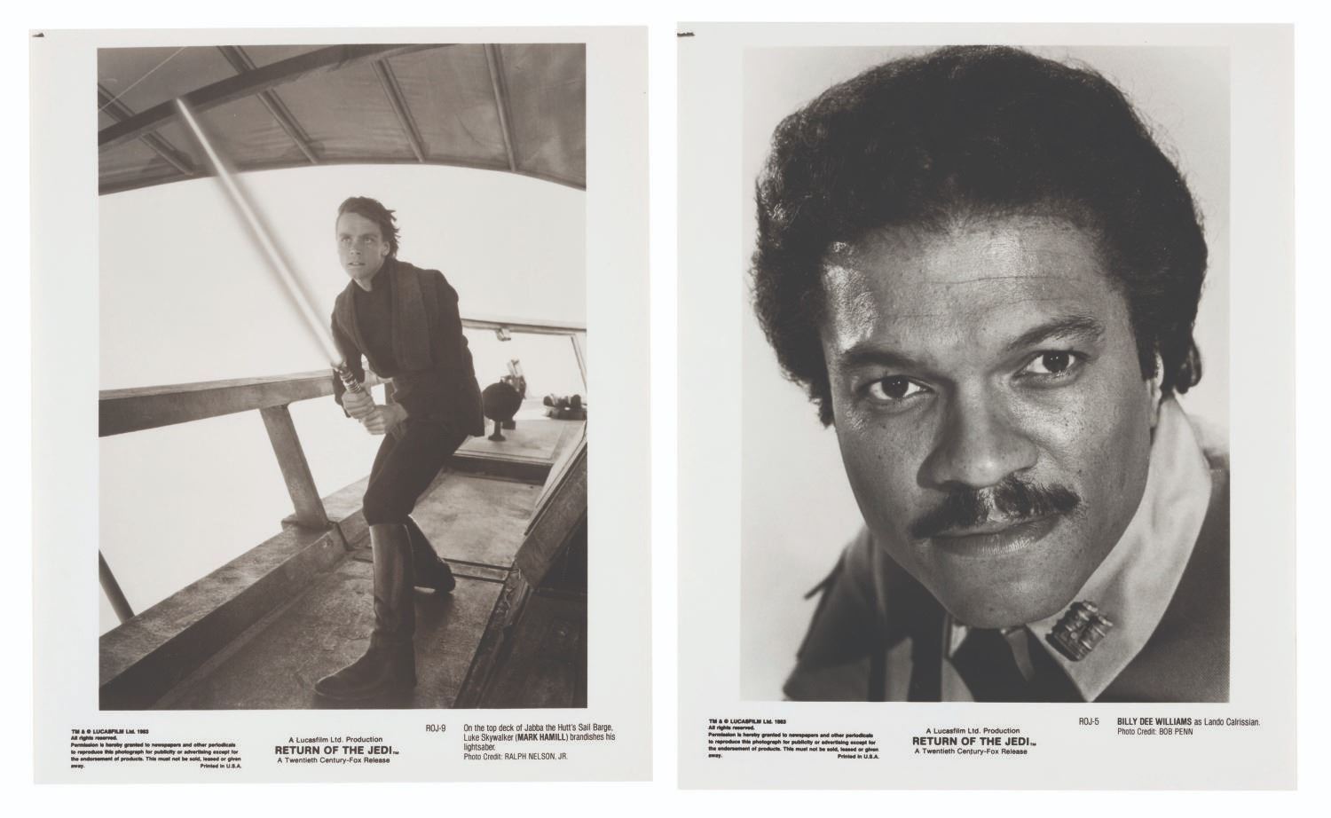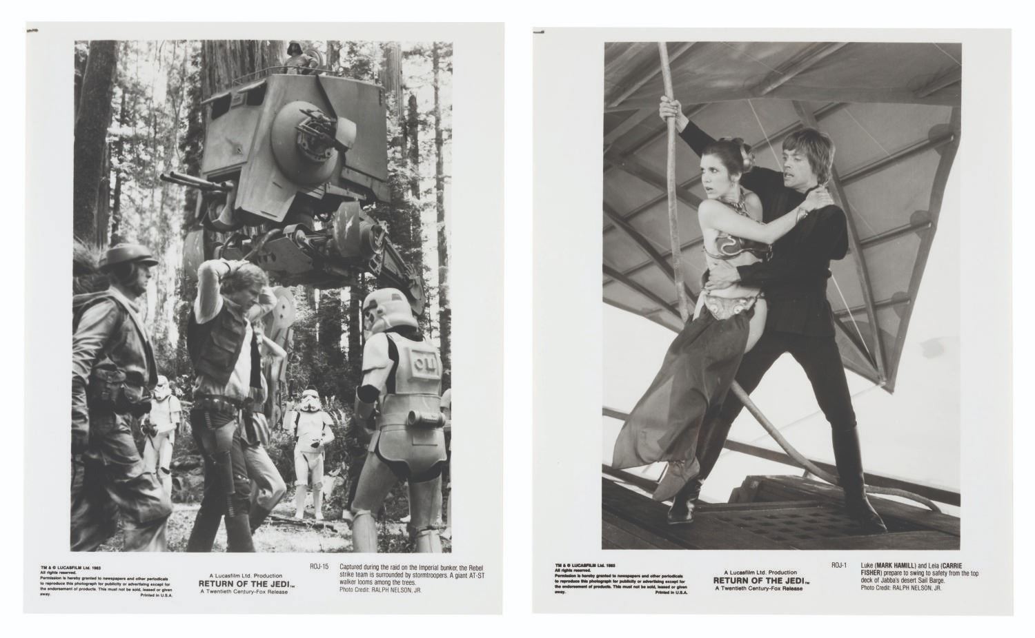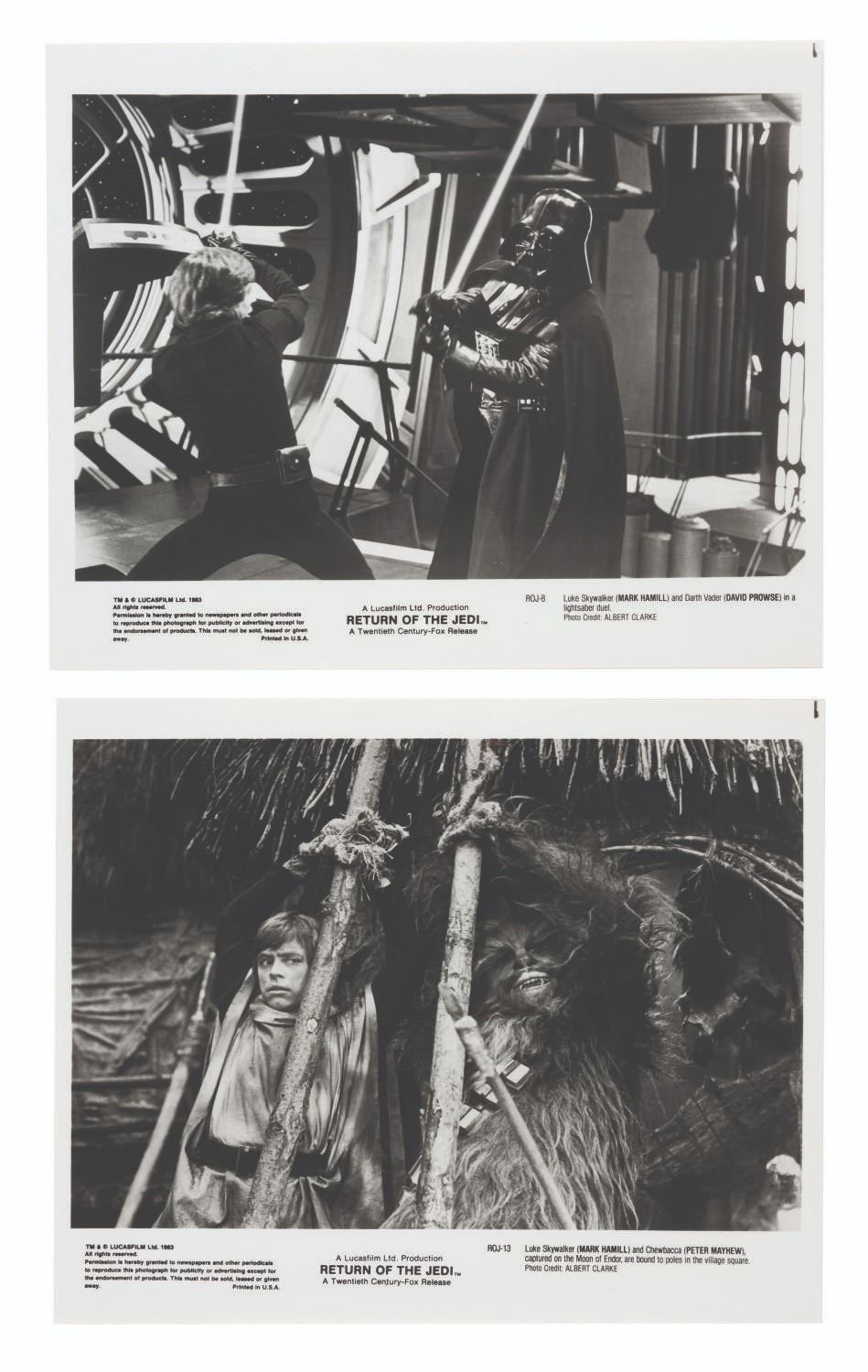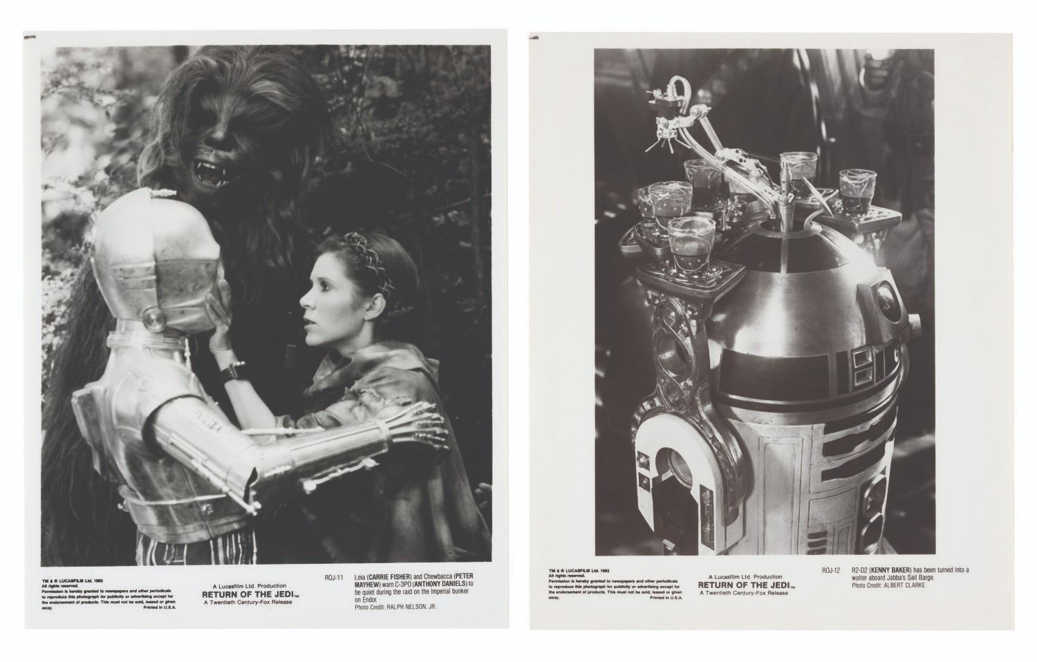 (20th Century Fox, 1983) A set of 16 publicity photos from "Return of the Jedi" with the original bag. The photos feature "Slave” Leia, Chewbacca, Lando Calrissian, Luke Skywalker and Han Solo in camouflage on Endor, and more. Measuring 8” x 10” each, the glossy photos are in fine condition. The original 8.5” x 11.25” brown paper bag is stamped "Return of the Jedi" and in very good condition with light creasing near the top.