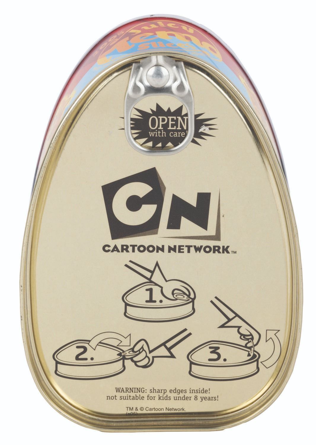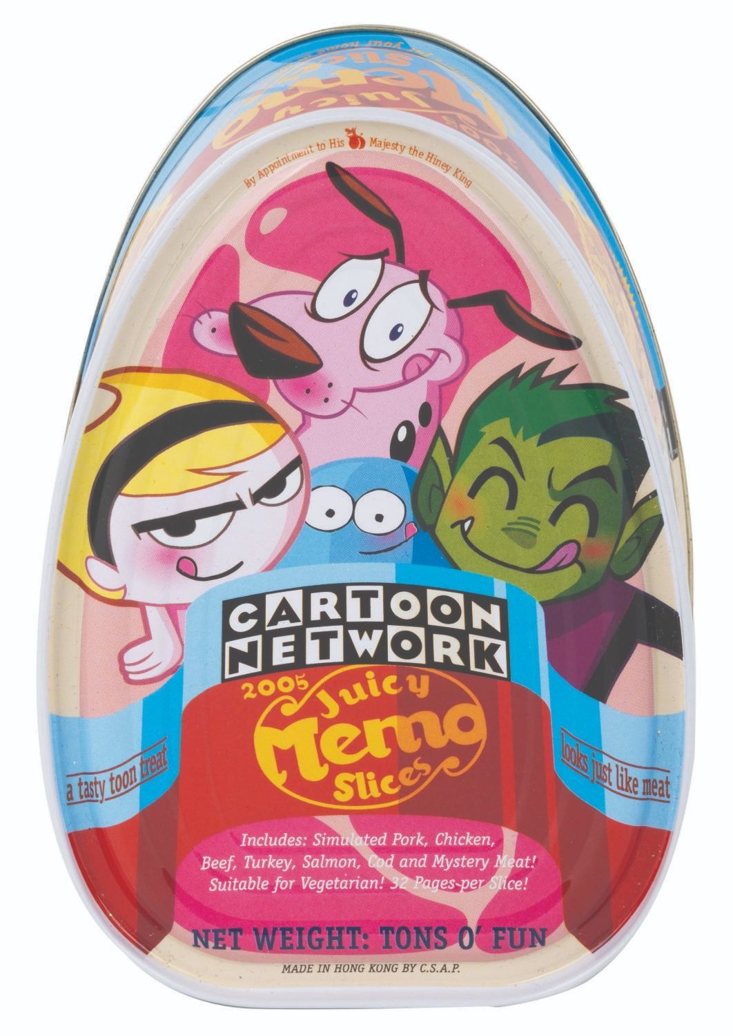 (Cartoon Network, 2005) A rare promotional can of "Juicy Memo Slices" featuring Cartoon Network stars, including Courage the Cowardly Dog, Mandy from "The Grim Adventures of Billy & Mandy," and more. The can includes 12 monthly "slices," each with 32 ham-shaped memo papers. Measuring 4" x 6", the can is in very good unopened condition with a light dent on the underside and a light scratch under the pull tab on the reverse.