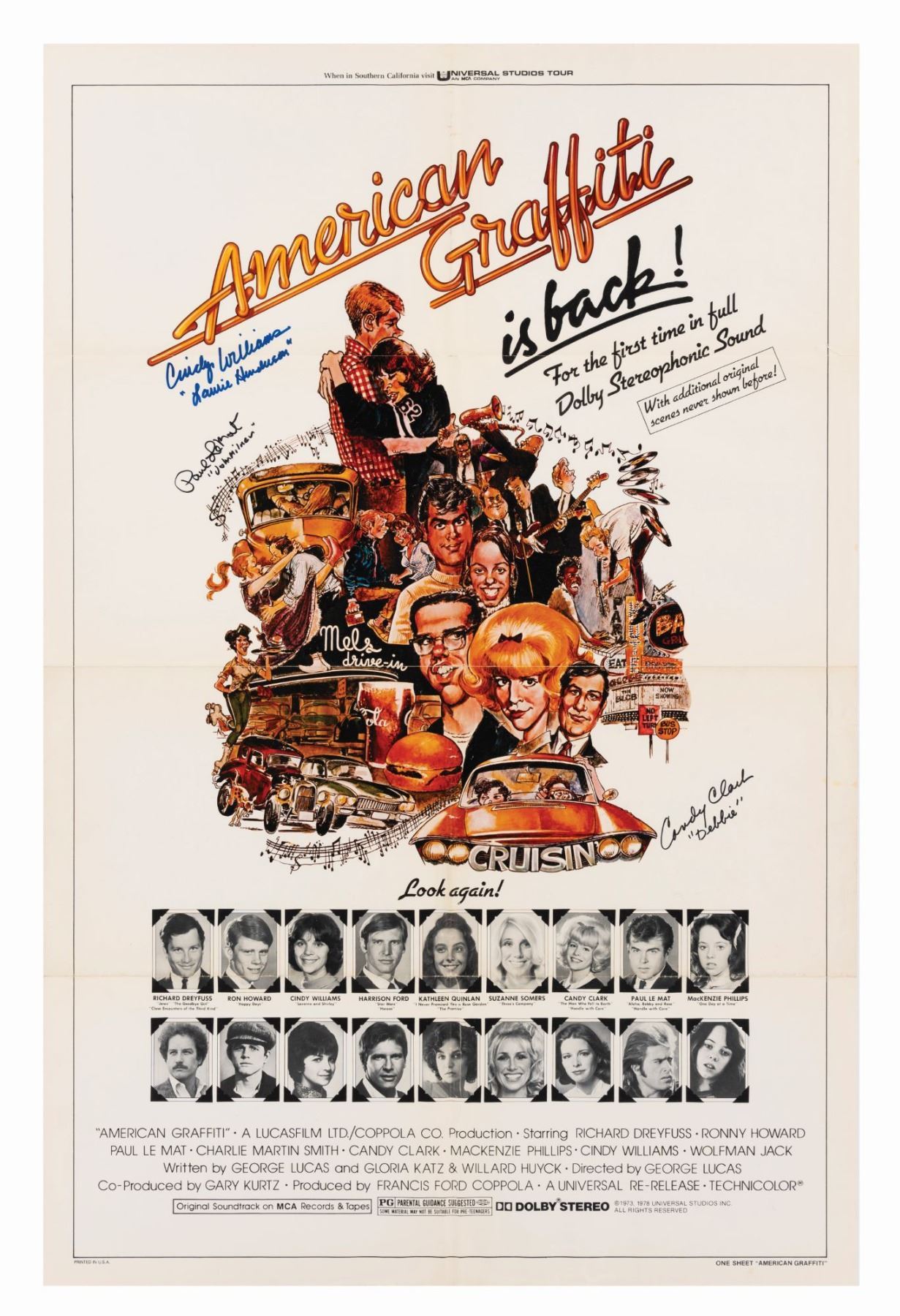 (Universal, 1978) A one-sheet poster for the 1978 theatrical re-release of "American Graffiti,” signed in ink by Cindy Williams, Paul Le Mat, and Candy Clark. Measuring 27” x 41”, the poster displays in good condition with typical wear and creases along the original folds, separation at the center fold points, a 1” tear to the upper right edge, and light discoloration from age.