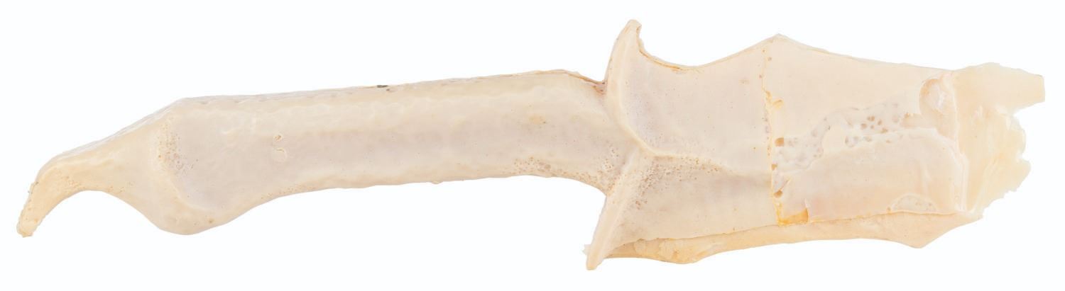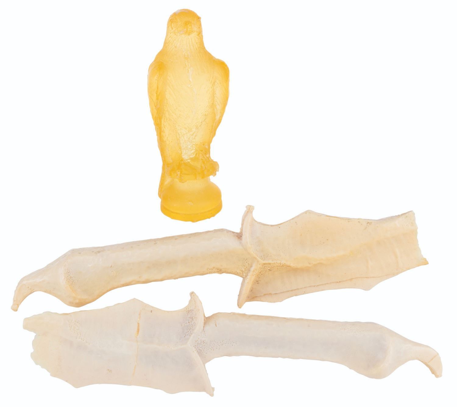 (Warner Bros., 2012) A pair of unfinished Orc dagger casts and a test cast of the falcon piece from Beorn’s chess set used in the production of "The Hobbit: An Unexpected Journey.” Measuring 15.5” x 3.75” and 1.5” thick and 8” x 3” x 3”, the resin daggers and chess piece are in good production-used condition with scratches and scuffs.