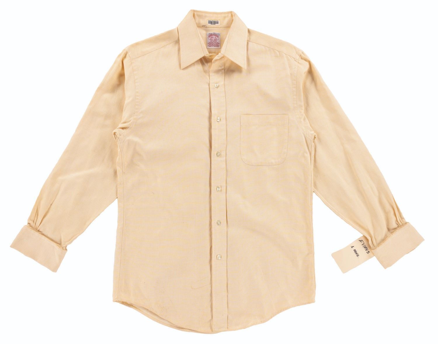 (Paramount, 2011) A button-up yellow shirt worn by Chris Evans during production of Marvel Studios’ "Captain America: The First Avenger.” A Disney Pictures & TV tag is on the collar, likely added after Disney acquired Marvel Studios, as well as "WDS EVANS” in marker. This shirt resembles one worn by Evans as a pre-transformation Steve Rogers in the film, though the on-screen shirt did not have a breast pocket. Labeled a size 14 ½, the shirt is in good condition with stains and wear from production use.