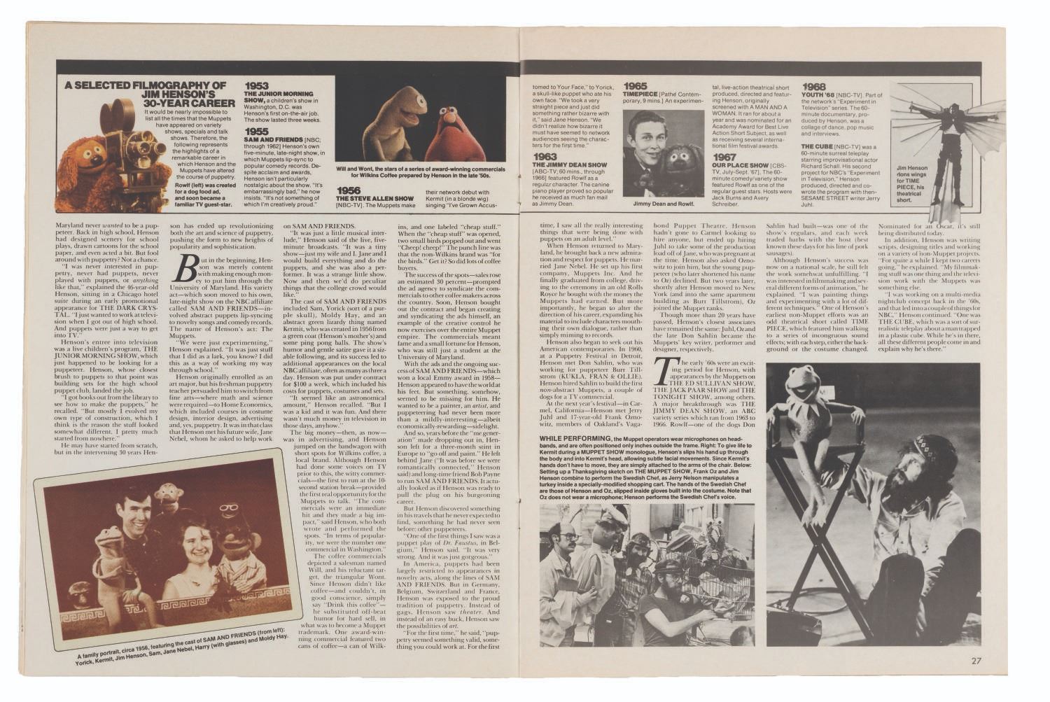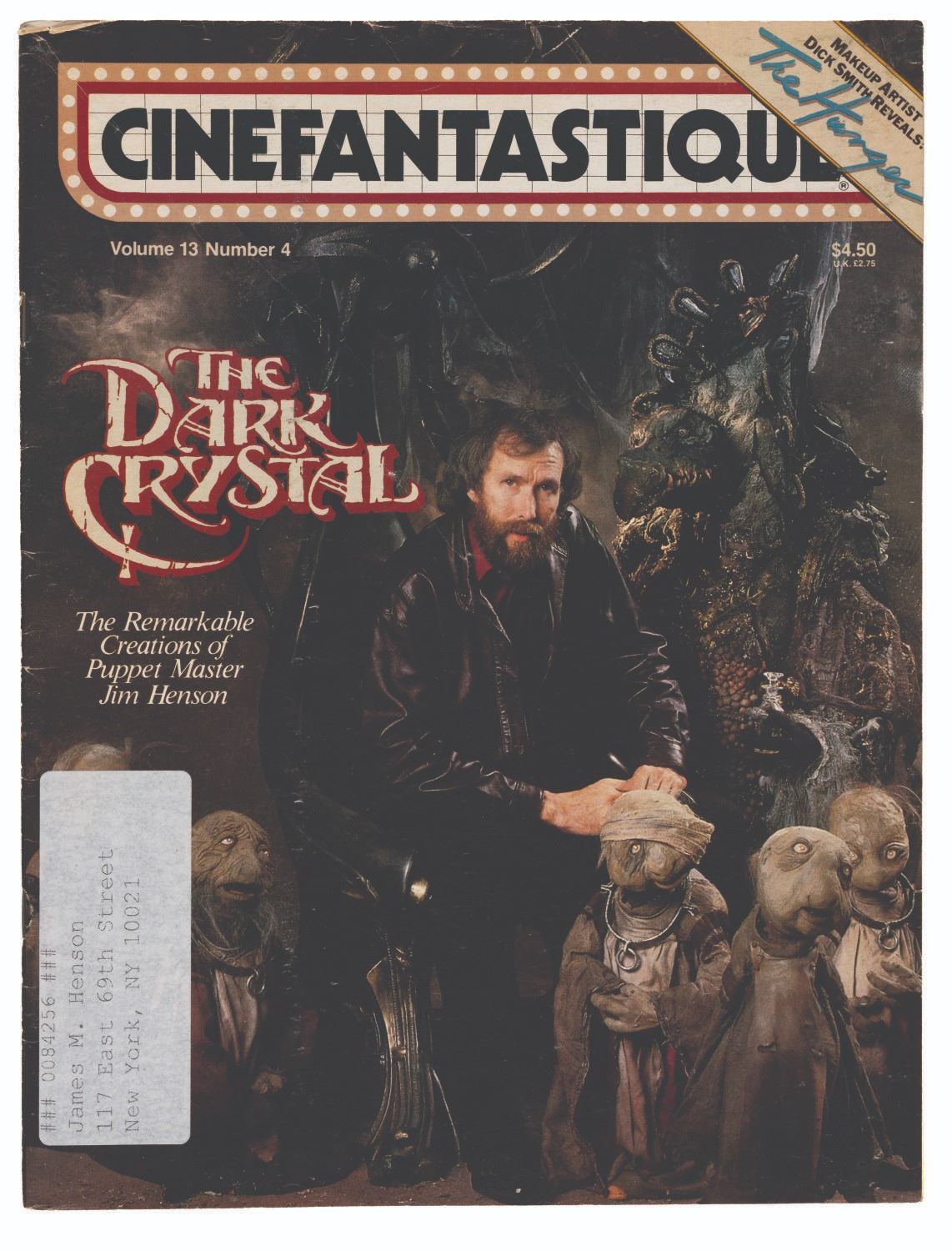 (Cinefantastique, 1982) Vol. 13 No. 4 of Cinefantastique magazine from Jim Henson’s personal subscription, with a cover story on Henson and his film “The Dark Crystal.” Measuring 8.5” x 11”, the magazine retains the original mailing label with Henson’s office address and is in good condition with wear and creases to the edges and spine from handling, a detached but included center page, and light discoloration from age.