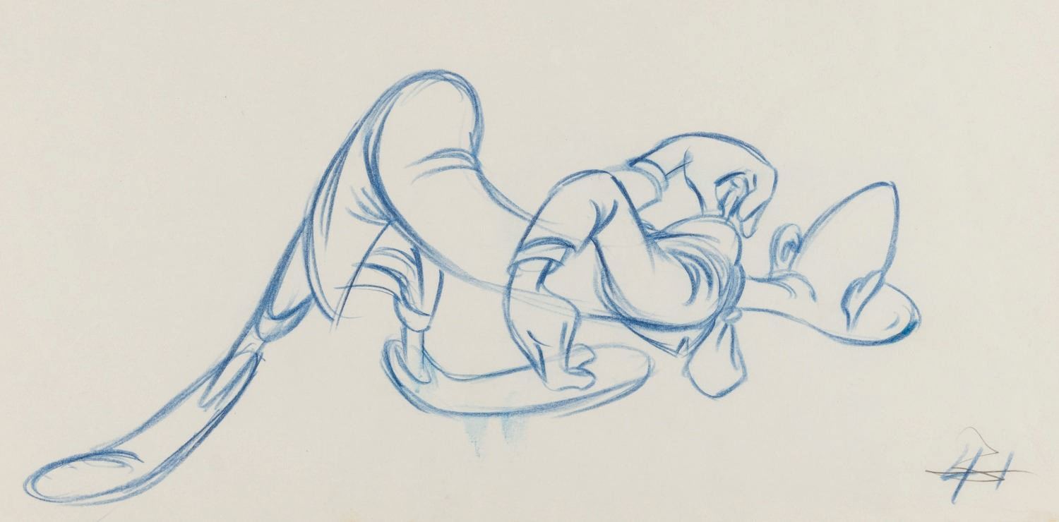 (Schlesinger, 1943) An original production drawing from "Coal Black and de Sebben Dwarfs” of Prince Chawmin’ as he tries to revive So White. With an image size of 9” x 4.25” on 9.5” x 12” animation paper, the drawing accomplished in color pencil is in very good condition with a smudge to one foot, and light wear from age and production use.