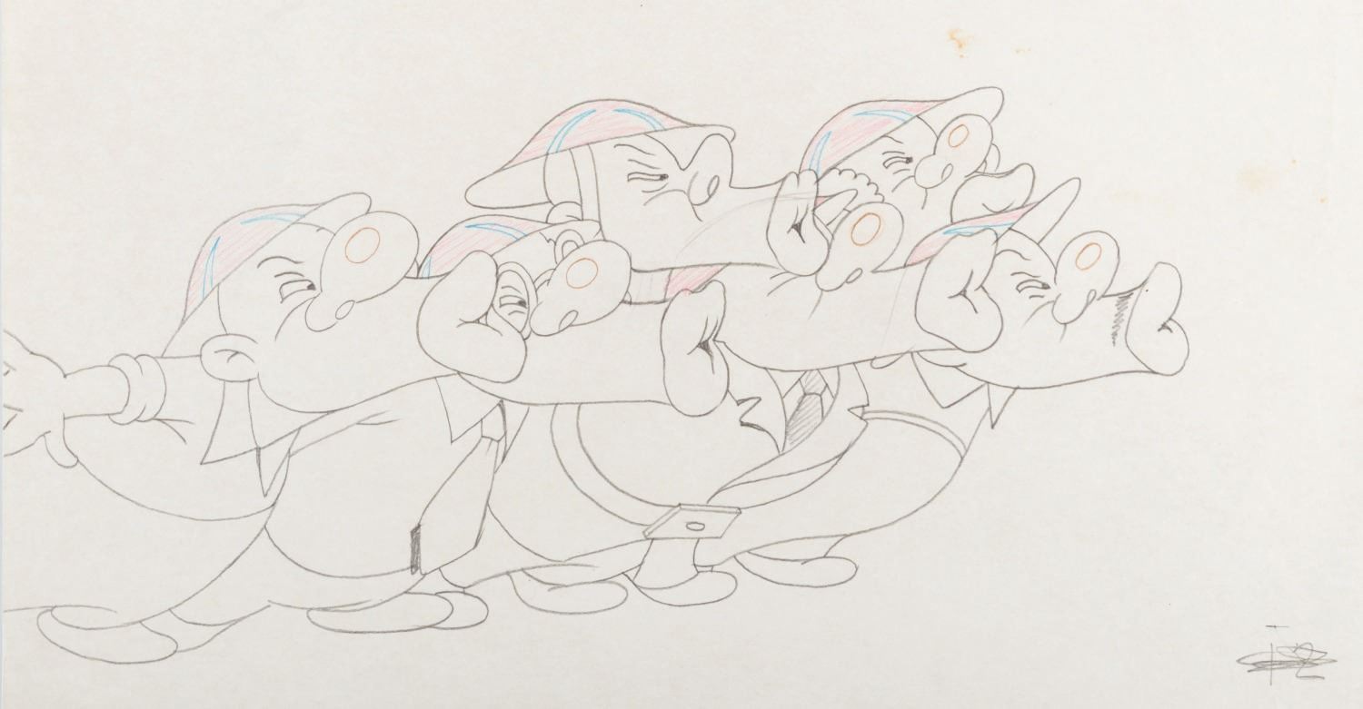 (Schlesinger, 1943) An original production drawing from "Coal Black and de Sebben Dwarfs” of six of the dwarfs. With an image size of 5” x 10.25” on 9.5” x 12” animation paper, the drawing accomplished in graphite and color pencil is in good condition with spots of discoloration, creases, and light wear from production use.