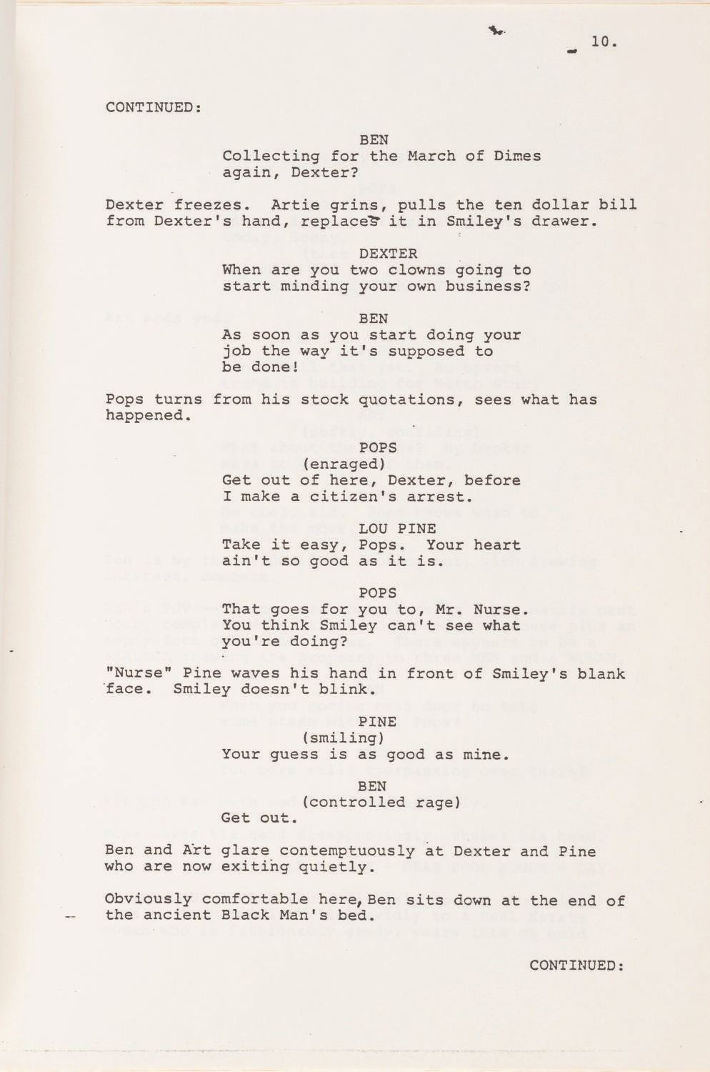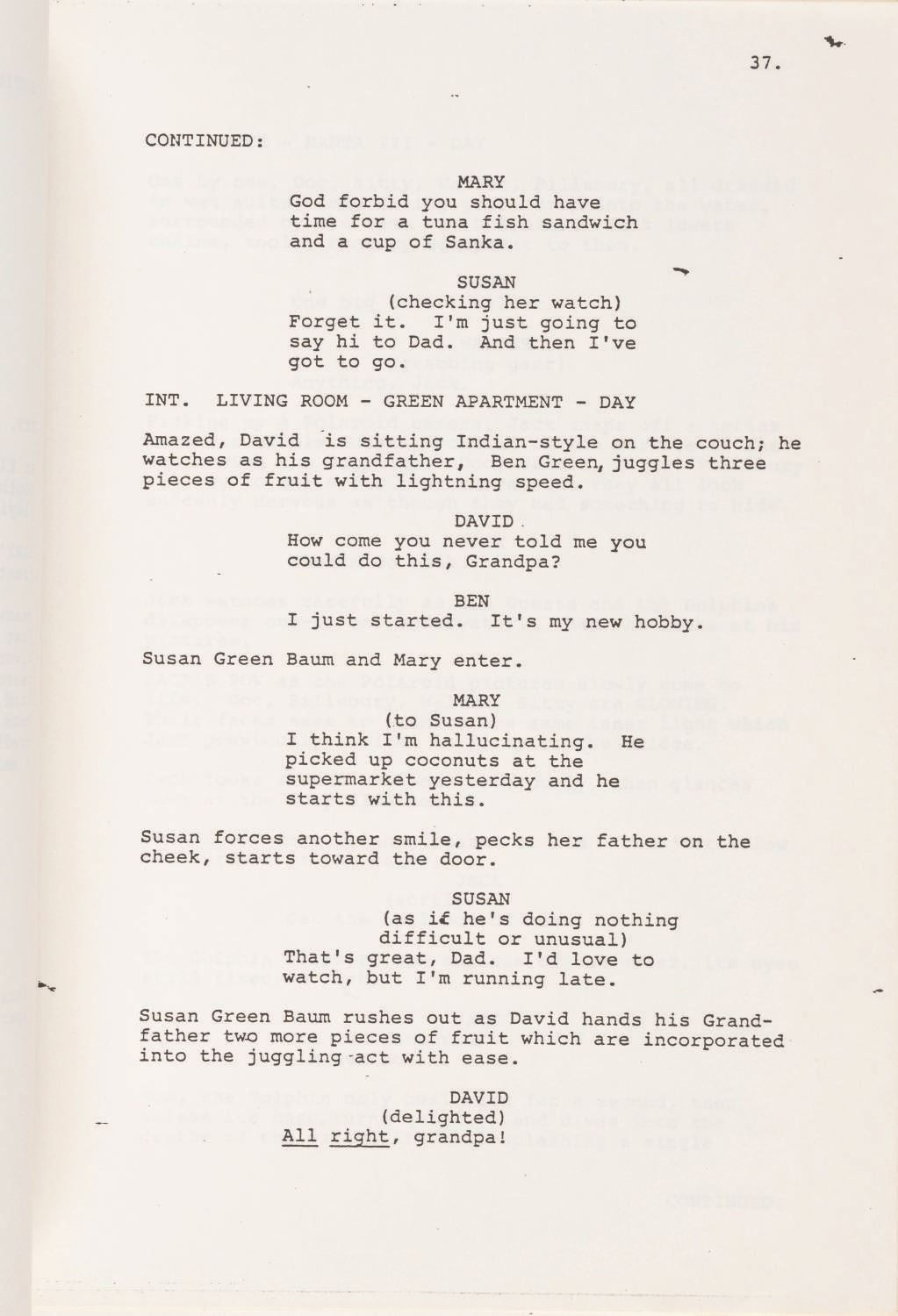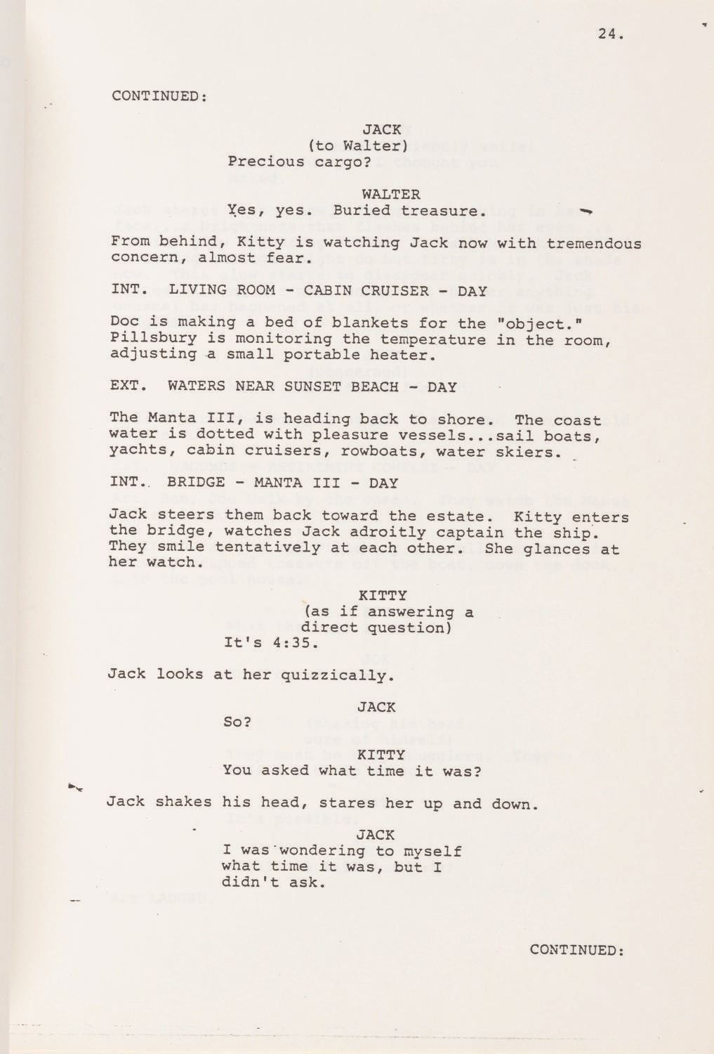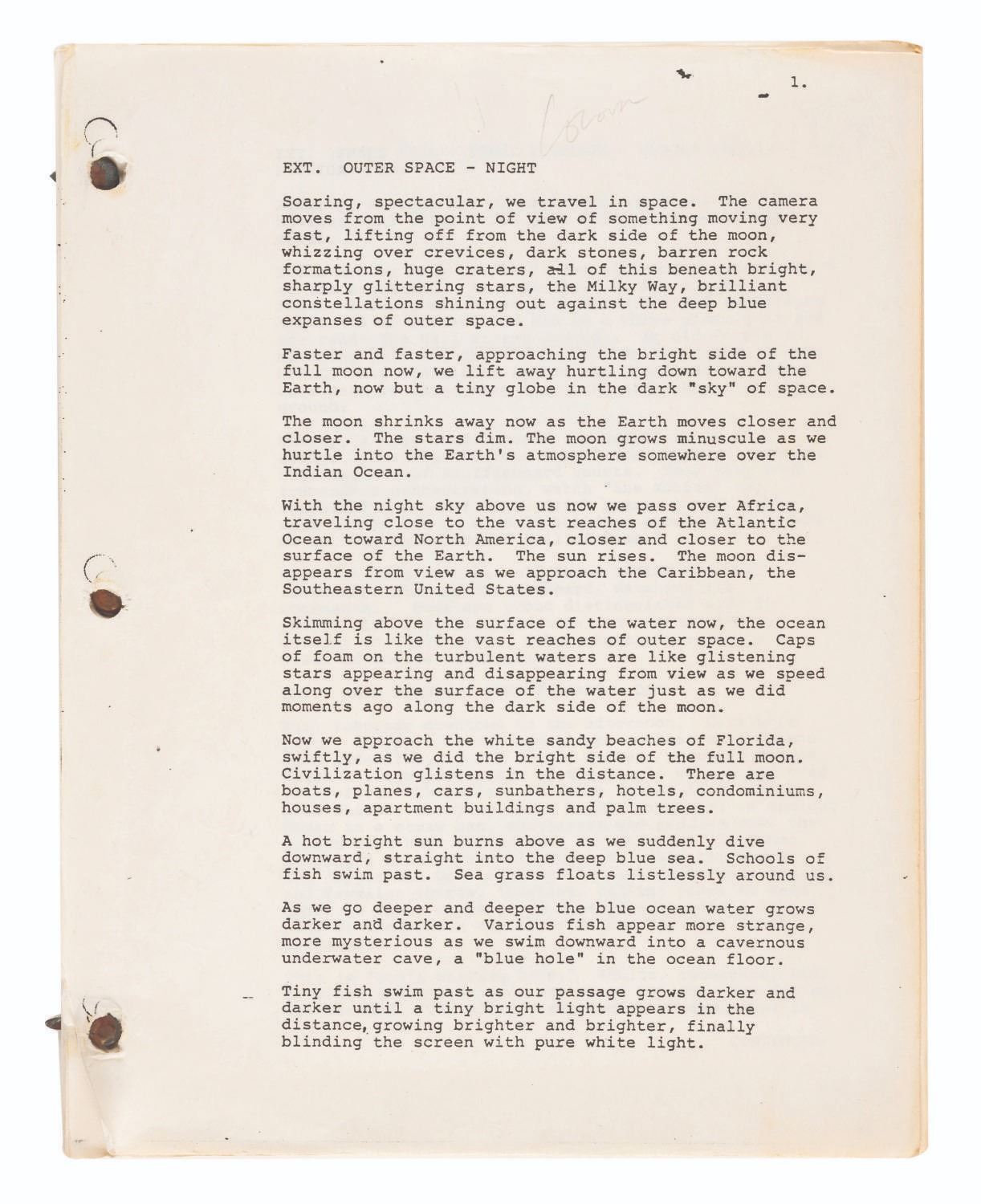 (20th Century Fox, 1985) A production script for "Cocoon,” directed by Ron Howard. Measuring 8.5” x 11”, the script displays in good condition with a missing title page, discoloration from age, a graphite inscription to the front, "Cocoon” written in black marker on the spine, edge wear, and creases from production use.