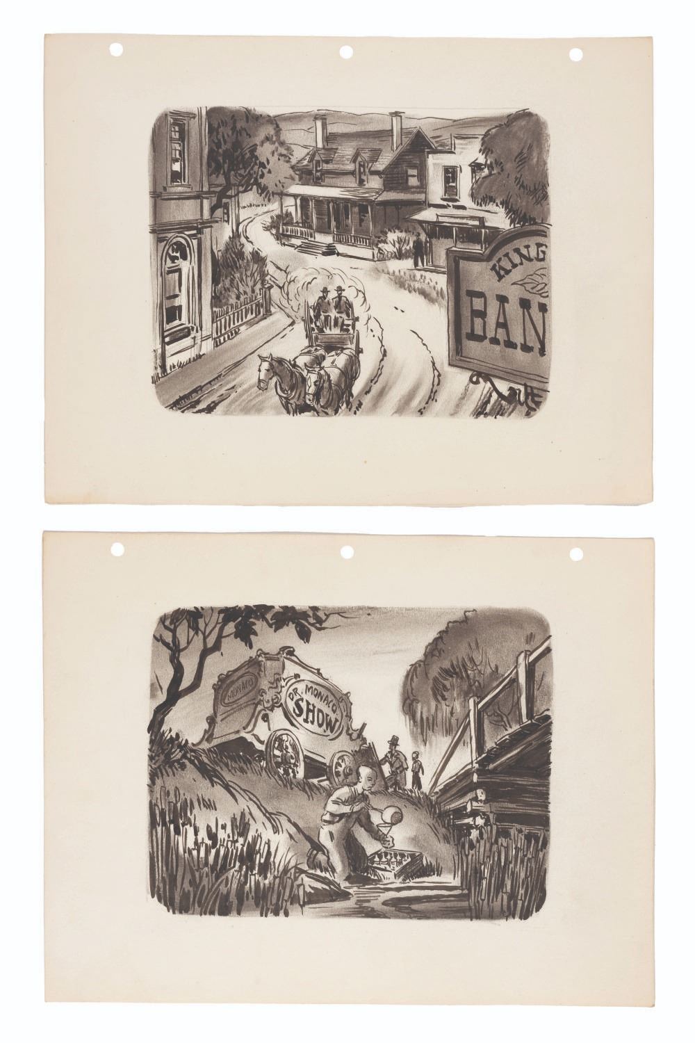 (Warner Bros., 1950) A collection of 10 story drawings by Disney Legend Harper Goff for the film "Bright Leaf” starring Gary Cooper and Lauren Bacall. Early in his career, Goff was a set designer at other studios, often uncredited for his work. Accomplished in graphite and ink on thick paper and measuring 8.75” x 11.25”, the drawings are in very good condition with light edge wear and discoloration from age.
