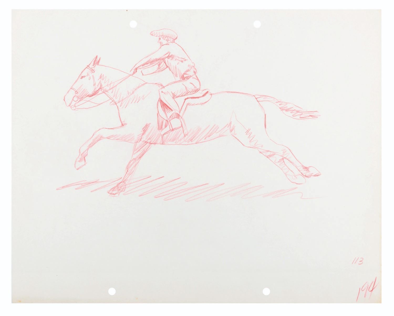 (Schlesinger, 1939) A collection of over 90 original production drawings of the Paul Revere’s ride sequence from the Merrie Melodies short "Old Glory,” directed by Chuck Jones. The cartoon features Uncle Sam telling Porky Pig stories of American history, with rotoscoping used for the human figures. Accomplished in graphite and colored pencils with the image size near 4.5” x 8” on each 9.5” x 12” sheet of animation paper, the drawings are in good to very good condition, with expected wear from aging and production wear, including folds to very few.