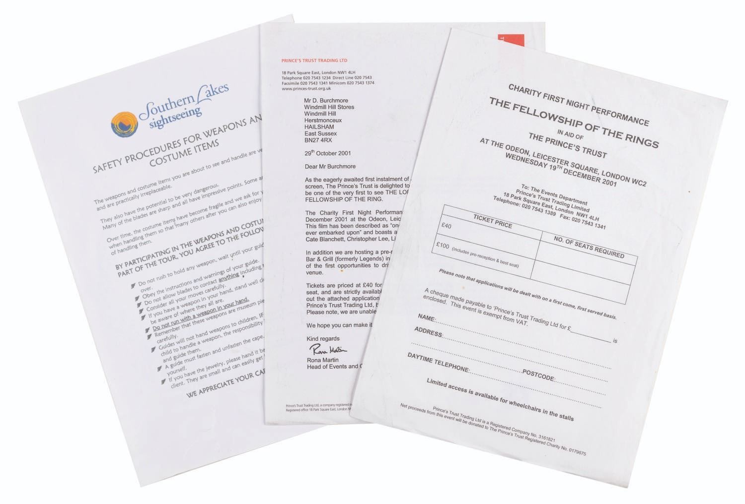 (Warner Brothers, 2001-03) A collection of rare Lord of the Rings film trilogy ephemera from around the world. Included from "The Fellowship of the Rings” are two admission tickets from Japan, a laminated security badge for the world premiere, a colorful 13-page press kit on the visual effects of the film, an invitation letter and order form for the Charity First Night performance of the film in London, two copies of an advance ticket sales button, two more buttons, and an invitation to the Warner Studio lot in Burbank for the film’s DVD release. From "The Two Towers” are a digital press kit on two CDs, a Japanese ticket stub, a postcard of the poster, an advance ticket sales button, and an invitation to a breakfast screening in Los Angeles for the DVD release. From "The Return of the King” are a ticket to the Prince’s Trust screening in London, a press CD with photography from the film, a New Zealand postcard with a Gandalf stamp, and a velveteen bag. Also included is an Opening Night party invitation for The Lord of the Rings stage production in London in 2007, and an info sheet from the New Zealand travel company providing tours of the filming locations. Measuring from the 3” x 2” Japanese tickets to the 12” x 9” visual effects press packet, the items are in good to very good condition with typical handling wear. All in all, this is a wide and varied collection that would be nearly impossible to duplicate.