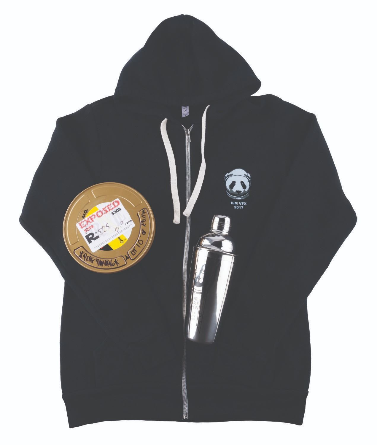 (Disney, 2017-2019) A pair of Industrial Light & Magic Visual Effects Team crew gifts from "The Last Jedi” and an empty film canister from production of "The Rise of Skywalker.” The gifts include a black hoodie featuring Space Bear on the left chest, which was the film's internal code name, and a custom cocktail shaker with the Rebel Alliance logo. The hoodie is labeled a size M, the cocktail shaker is 9” tall and 3.5” in diameter, and the canister is 7.25” in diameter. All the items are in very good to fine condition with light wear.