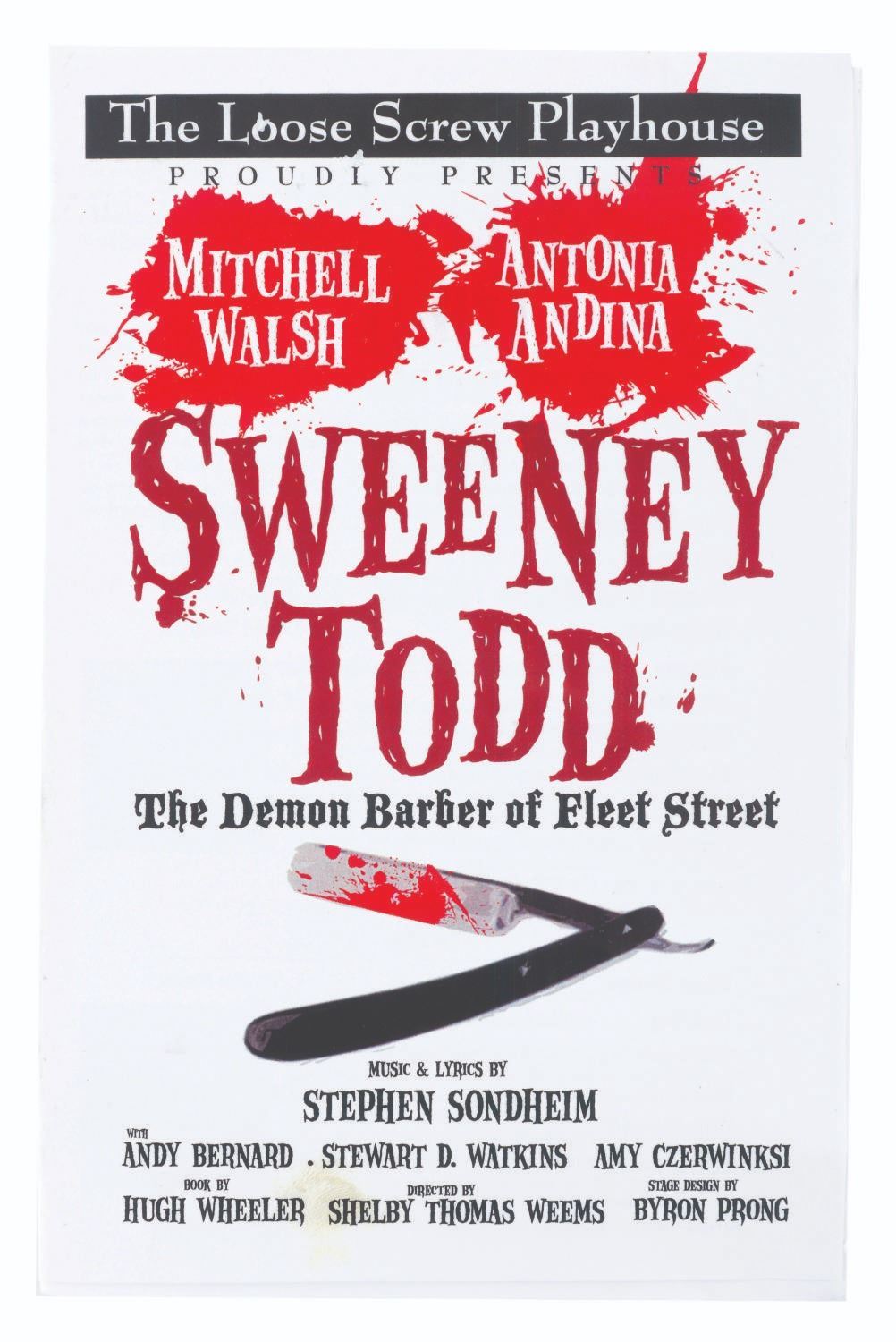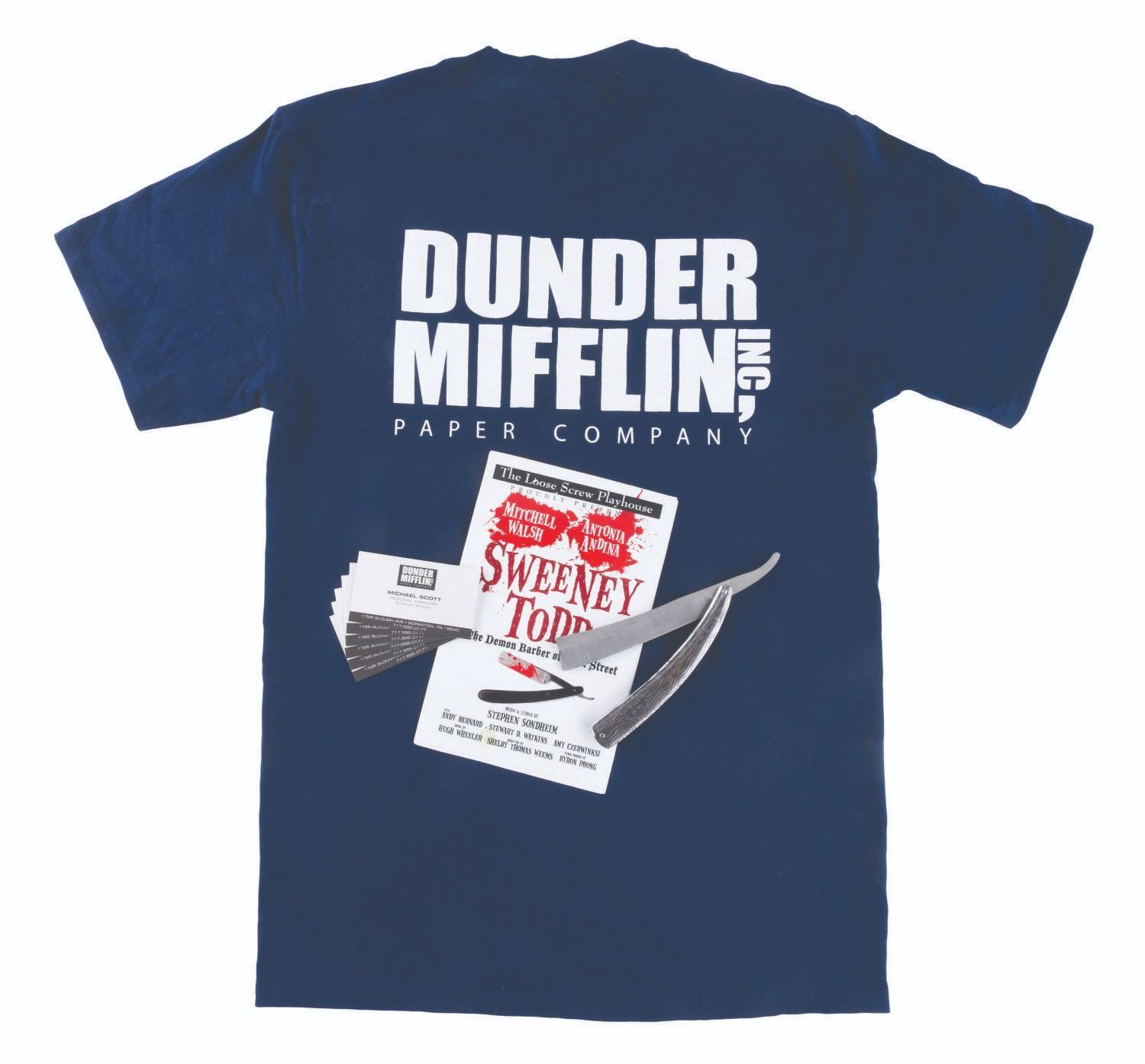 (NBC, 2010) A collection of props from "The Office” including seven Michael Scott business cards, a prop straight razor and Sweeney Todd program from the season 7 episode "Andy’s Play,” and a Dunder Mifflin crew gift shirt. The 2” x 3.5” business cards and prop straight razor are in very good condition, with the 8.5” x 5.5” program in good condition with creases and wear from production use. The shirt labeled "Adult S” is in fine condition.