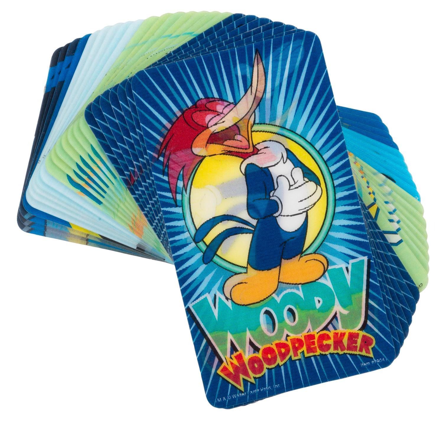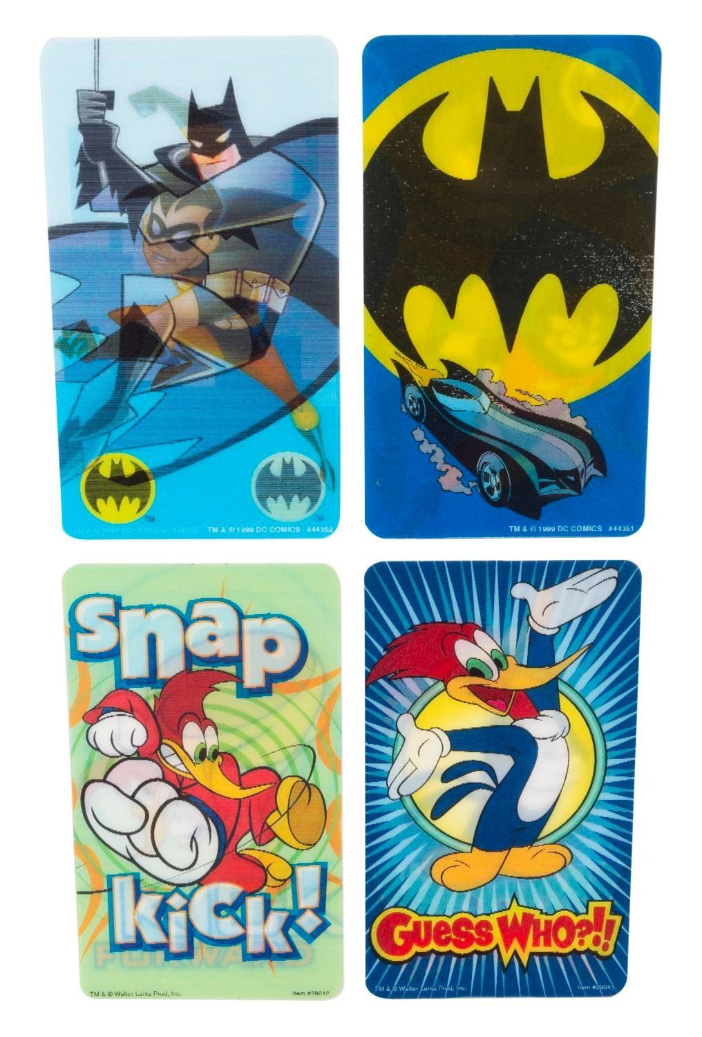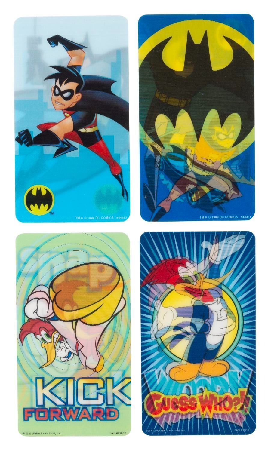 (Lantz/DC Comics, 1999) A collection of 23 Woody Woodpecker and Batman lenticular stickers. The sticker designs include seven of Woody laughing, seven of Woody practicing karate, five of Batman and Robin swinging on a rope, and four of Batman and Robin with the Batmobile. Measuring 3" x 5.5", the stickers are in fine, unused condition.