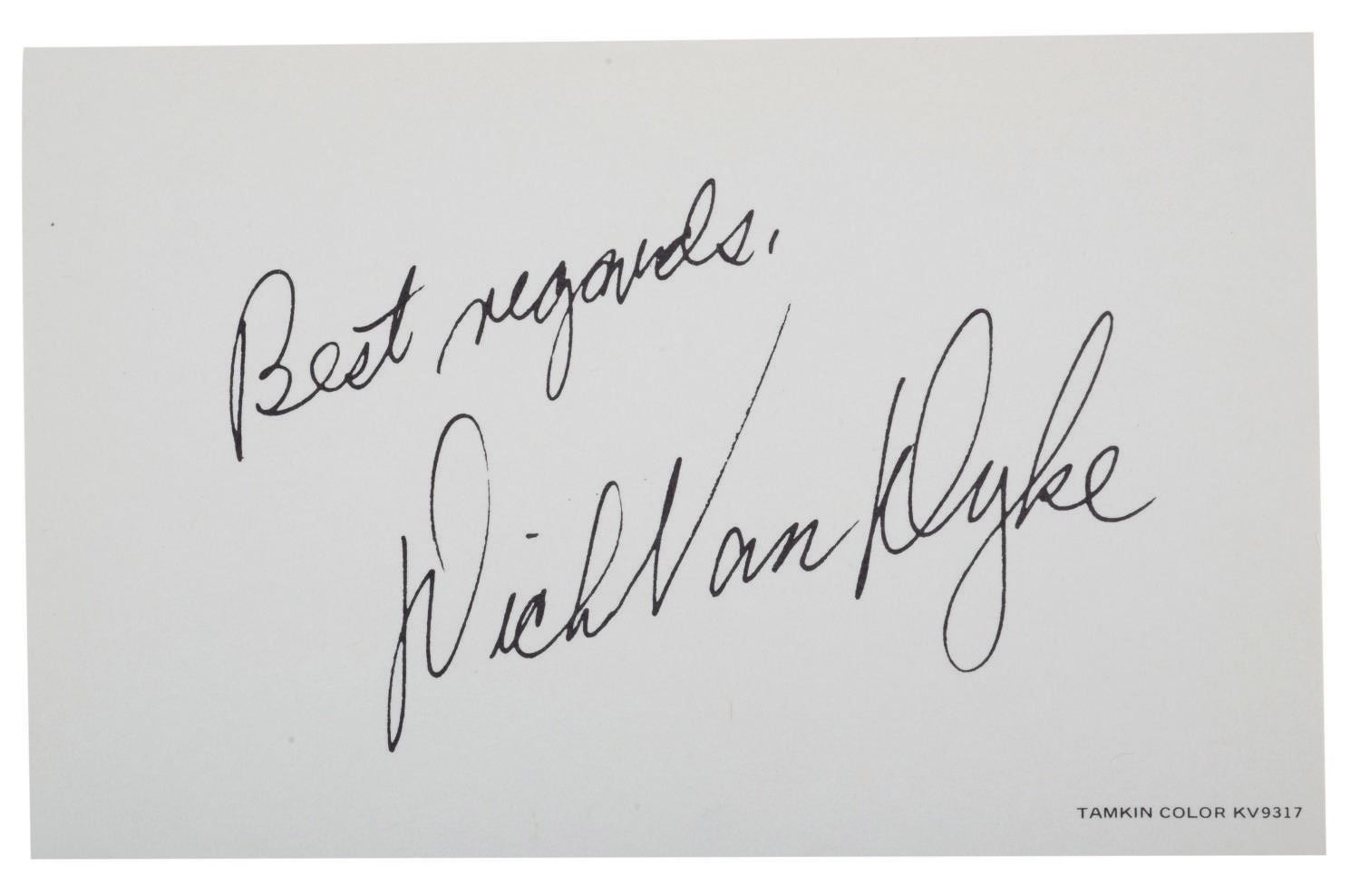 (Van Dyke) A 5.5"x3.5" Dick Van Dyke fan card with printed signature. The piece is in very good condition with minor wear from handling.