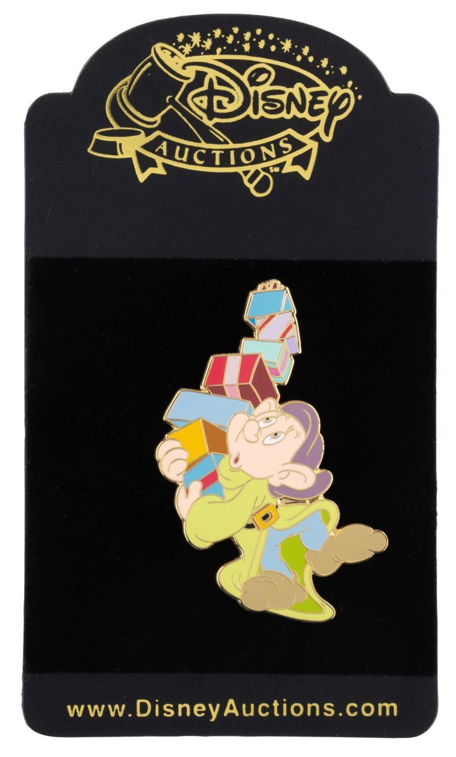 (Disney, 2003) A Disney Auctions pin of Dopey balancing presents, released in a limited edition of 1000. Measuring 1.5" x 2", the pin is in fine condition on the original card.