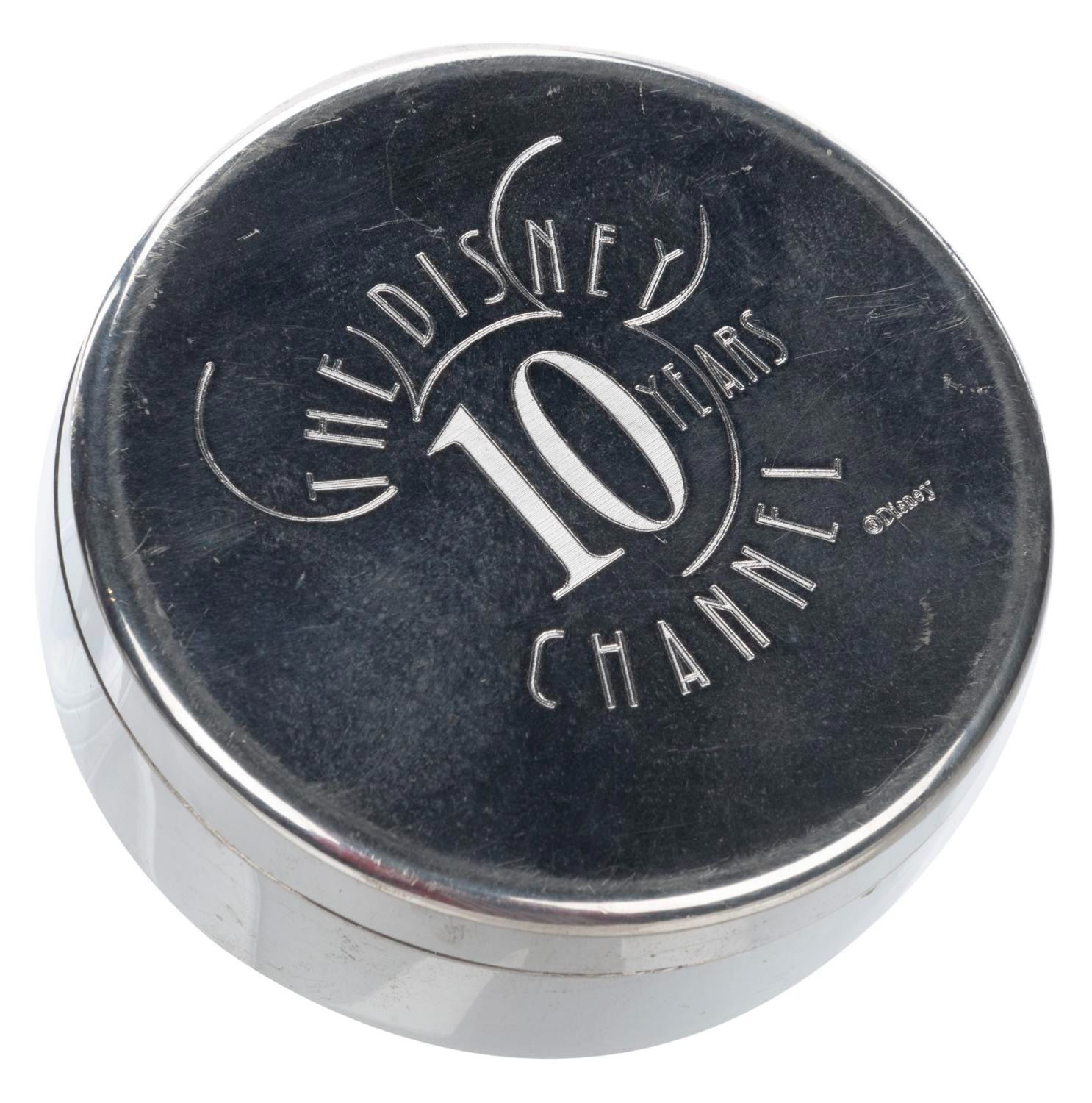 (Tiffany and Co., 1993) A velvet-lined Tiffany and Co. pewter trinket box commemorating The Disney Channel's 10 year anniversary. Measuring 3" in diameter and 1" tall, the box is in good condition with light scratches.