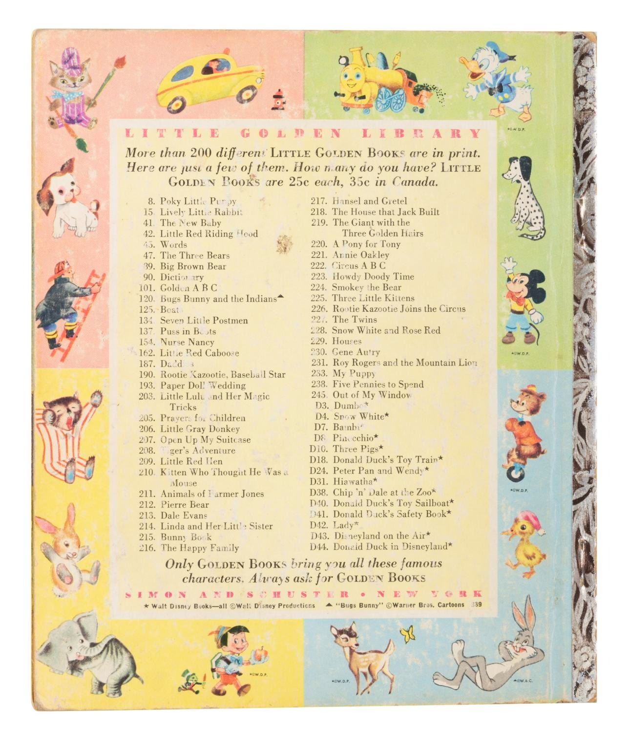 (Simon & Schuster, 1955) A Little Golden Book titled Donald Duck in Disneyland, featuring Donald and his nephews visiting the Park in its opening year. Measuring 6.5" x 8.5", the book is in good condition with typical handling wear to the cover, including fading to the back, and a name written inside.