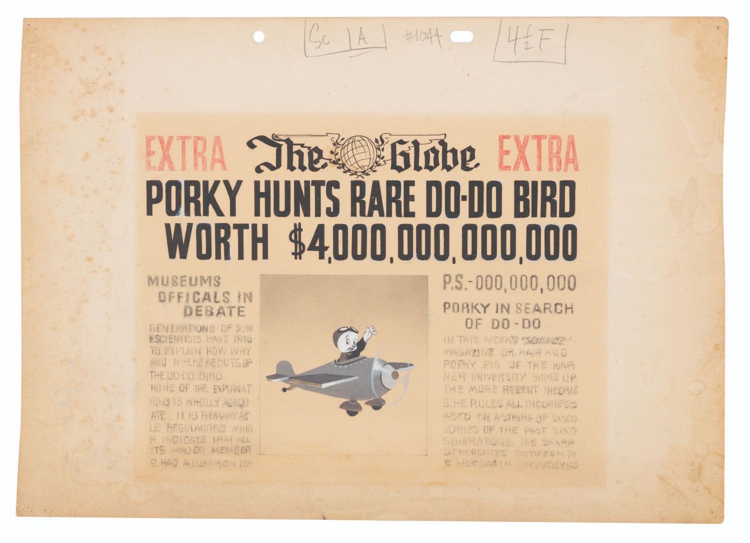 (Warner Bros., 1949) The original production background for the opening shot of "Dough for the Do-Do,” directed by Friz Freleng. This Merrie Melodies short was virtually a shot-by-shot remake of Bob Clampett’s 1938 Looney Tunes cartoon "Porky in Wackyland.” Accomplished in ink, gouache, and pencil and measuring 7.5” x 9.5”, the background displays in good condition, with wear including pinholes from production use, discoloration to the paper from age, light smudging to the pencil written text on the left side, and spotting to the sides that do not affect the image.