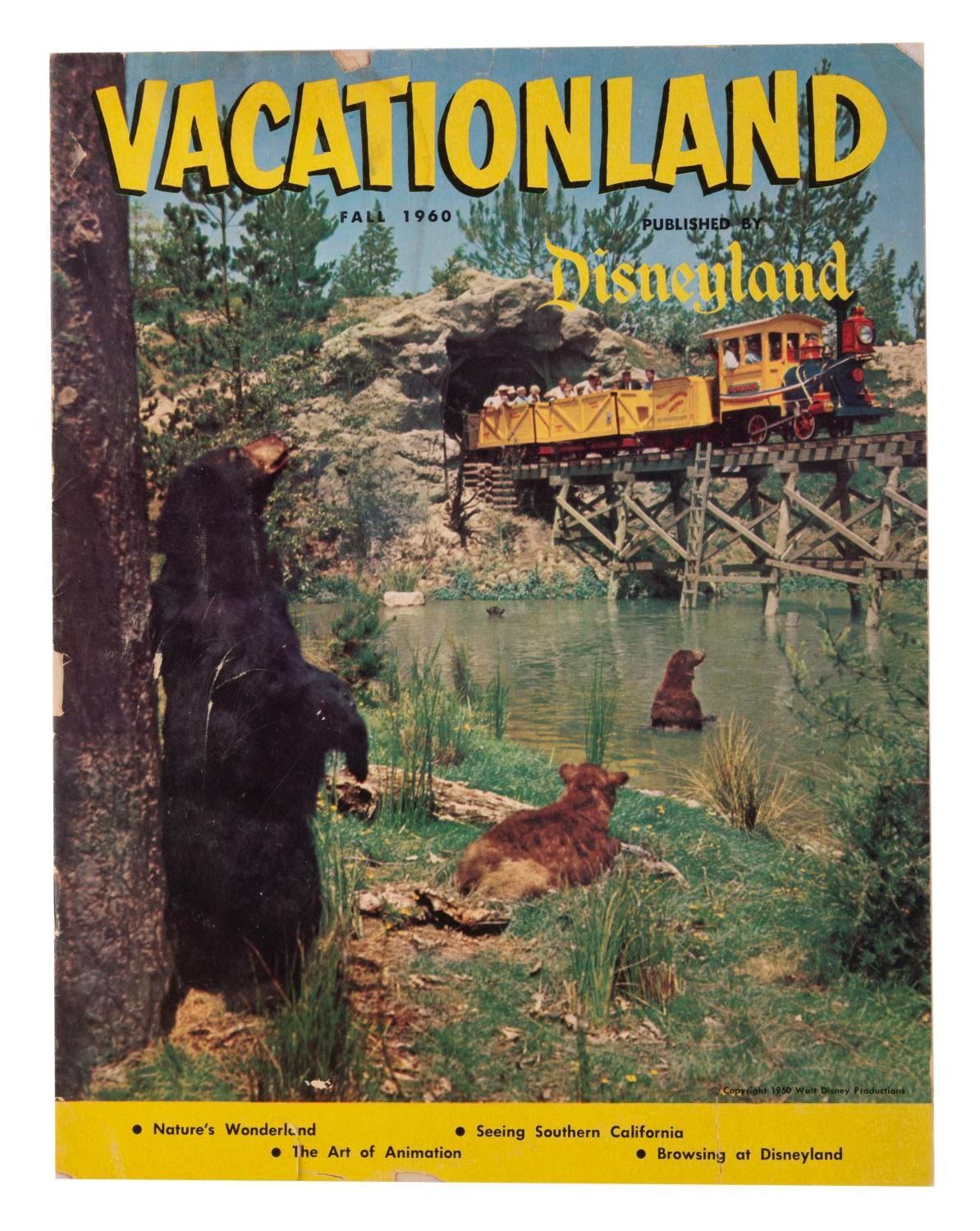 (Disneyland, 1960) A fall 1960 issue of Disneyland's Vacationland magazine with a cover featuring Nature's Wonderland and articles on The Art of Animation, Disneyland's Color Folio, and Browsing Through the Magic Kingdom. Measuring 8.25" x 10.75", the magazine is in poor condition with heavy edge wear and tear, 2" and 6" splits on the spine with near total separation of the cover, a 1" tear on the bottom edge of all pages, water stains, and warping.