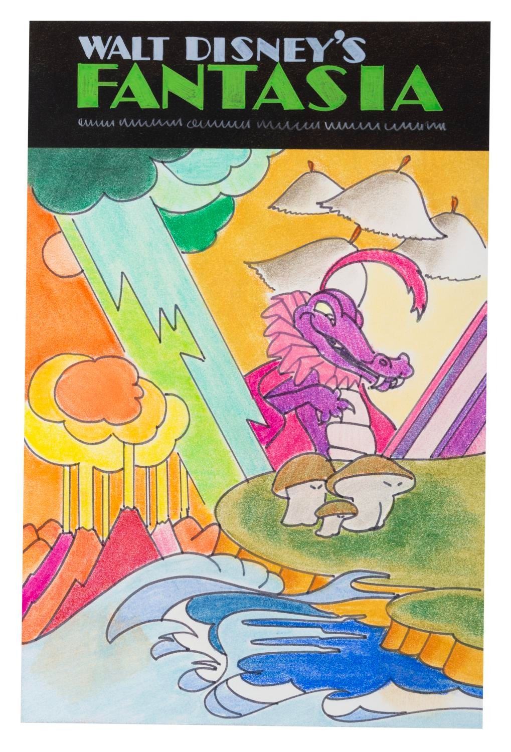 (Disney, 1969) A concept painting for a "Fantasia" re-release poster in 1969. The poster for 1969 featured a psychedelic, near-fluorescent design that differed greatly from earlier posters. Measuring 8.25" x 12.75", the concept accomplished in crayon, felt tip, and gouache displays in very good condition, with two 2" spots of faint discoloration from aged adhesive on the back.
