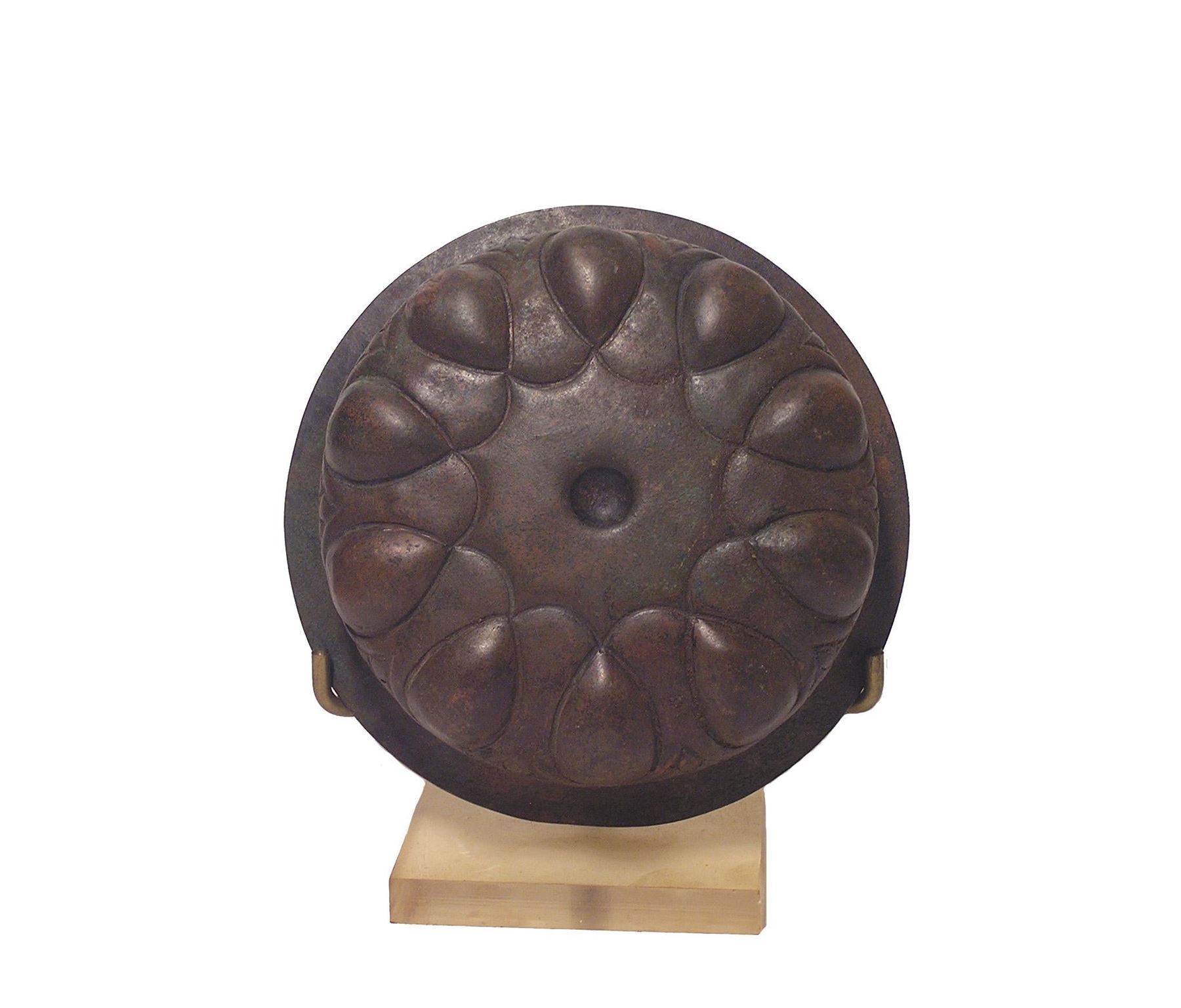 A shallow bowl with central omphallos, surrounded with radiate tear shaped bosses and leaf shaped tongues surrounding in one row. A wide lip surrounds the bowl. Private Collection, CA, prior to 1990. Literature: cf: Wooley, LAAA VII, 1914-1916, pl. XXI Also, see Morrey, Bunker, Porada, and Markoe, Nasli Heeramaneck Collection. LACMA, 1981; 627-8