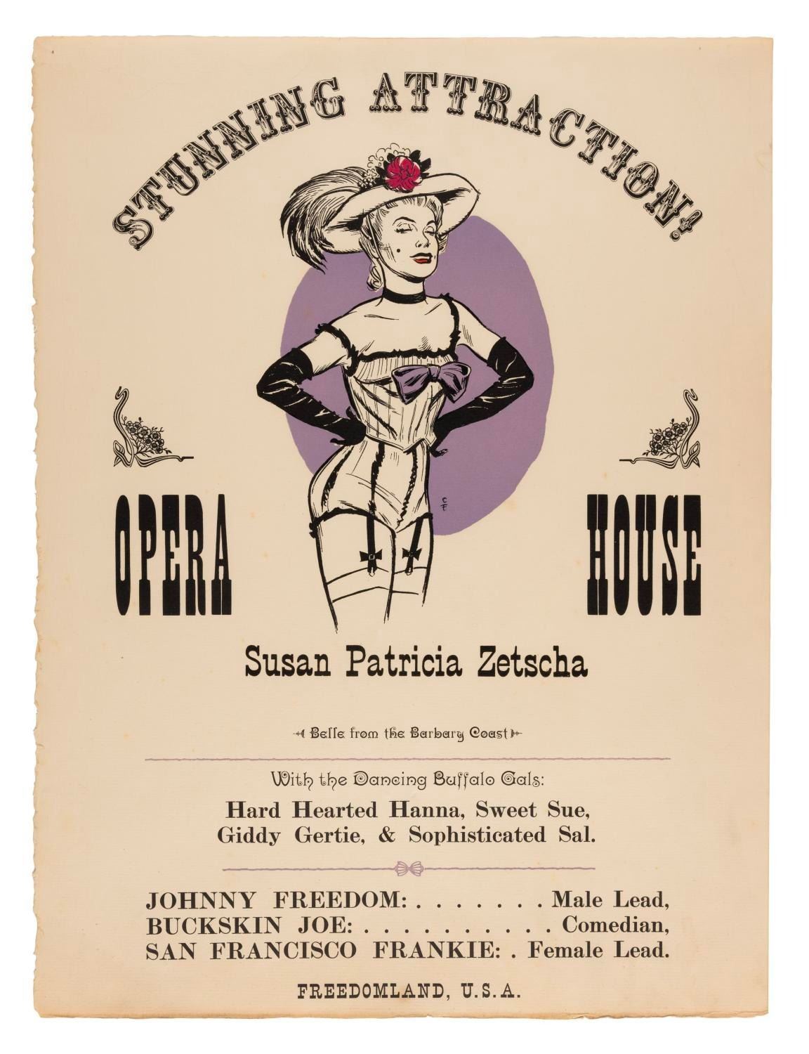 (Freedomland, 1960) A very rare personalized Opera House souvenir poster from Freedomland, an American history theme park in the Bronx from 1960 to 1964. The park was the brainchild of C.V. Wood, who had worked on the construction and management of Disneyland during its earliest years. In the Old Southwest section, the Santa Fe Opera House and Saloon was a soft drink bar with a 30-minute entertainment revue of showgirls, singers, and comedians. This souvenir poster is personalized with the name Susan Patricia Zetscha as the headliner. Measuring 12” x 16”, the poster displays in very good condition, with light wear from age including very faint spotting, a pinhole and a 0.5” tear, and discoloration along the bottom edge.