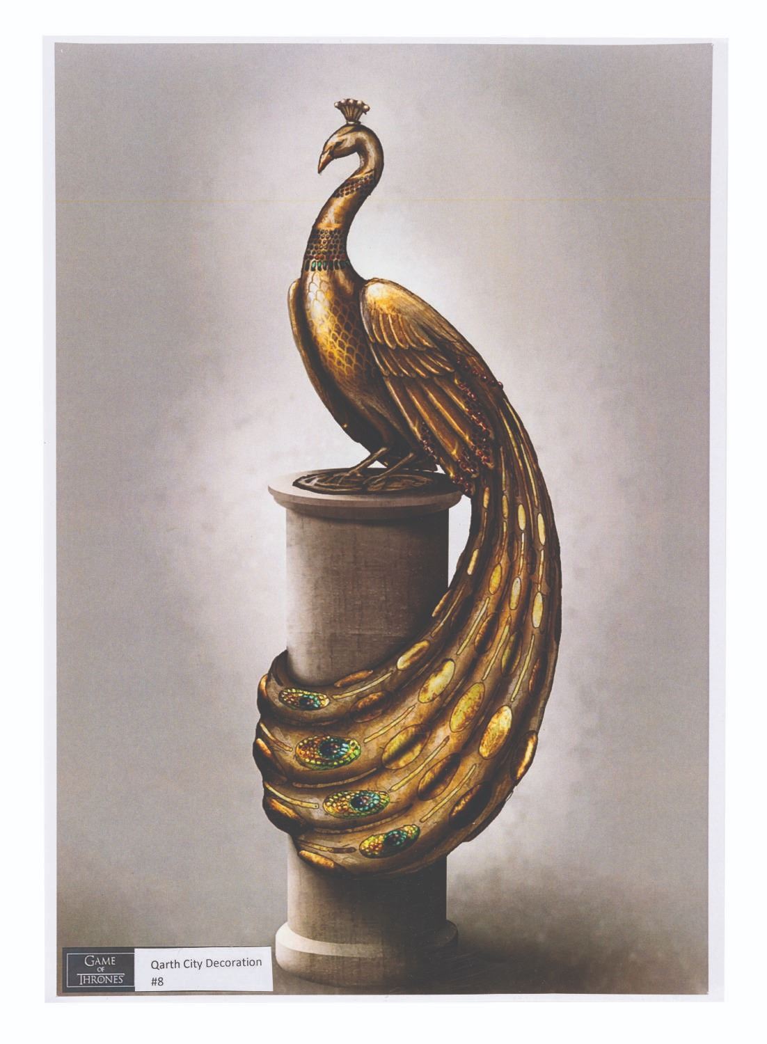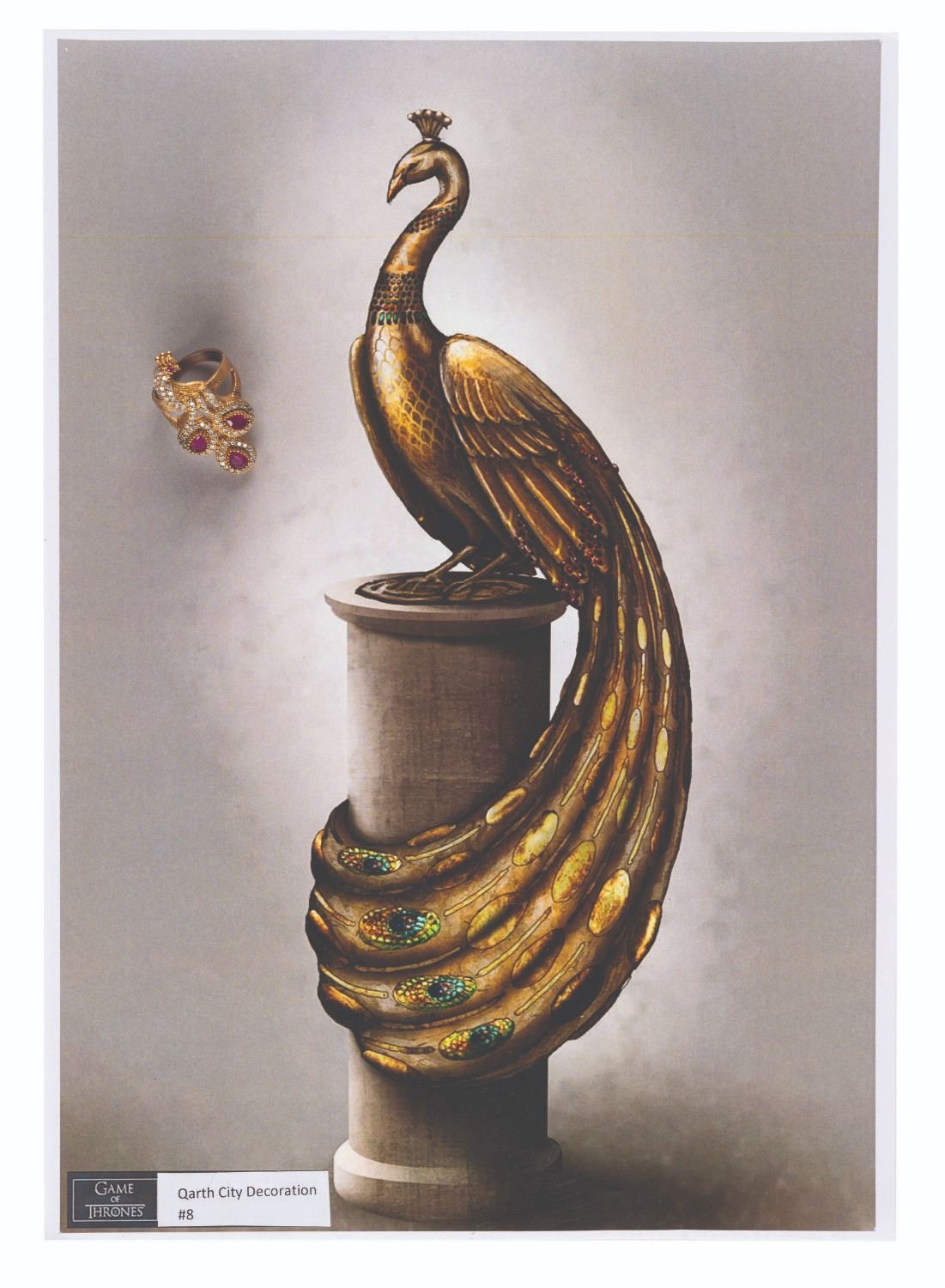 (HBO, 2011-2019) A “Game of Thrones” prop ring worn by a background citizen in the city of Qarth, with a print of a peacock statue concept for a city decoration. Measuring 0.75” in diameter and 1.75” long, the sterling silver ring and 8.25” x 11.75” print both display in very good condition.