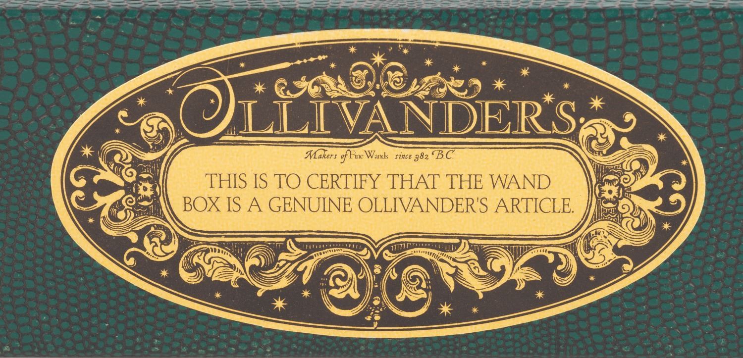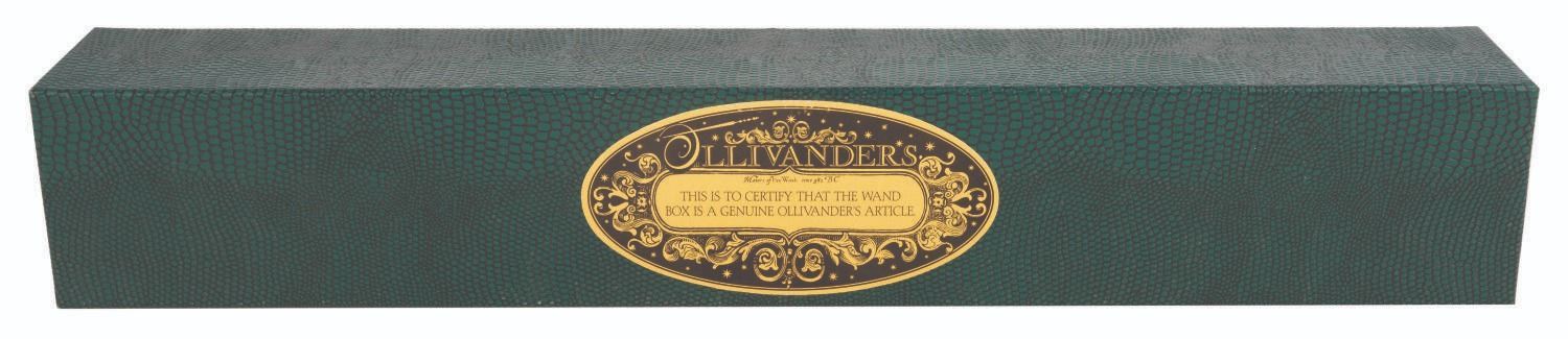 (Warner Bros., 2001-2011) A prop Ollivander’s wand box from production of one of the Harry Potter films. This type of box can be seen on shelves in "Harry Potter and the Sorcerer’s Stone,” as Harry searched Ollivander’s for his own wand. Measuring 14.25” x 2” x 2.25” deep, the box displays in fine production-used condition.