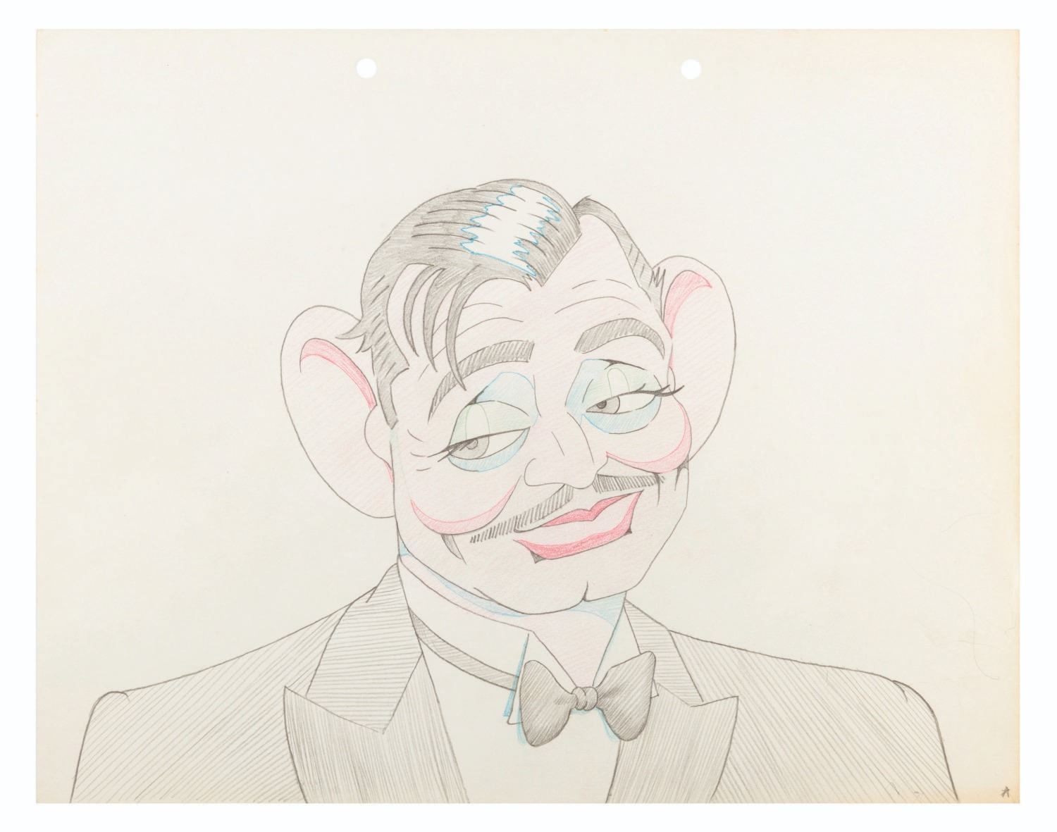 (Schlesinger, 1941) A model drawing of Clark Gable from the Merrie Melodies short, "Hollywood Steps Out.” Accomplished in graphite and colored pencil, with a character image size of 7.75” x 10.75” on 9.5” x 12” animation paper, the drawing is in very good condition with light wear and discoloration from age.
