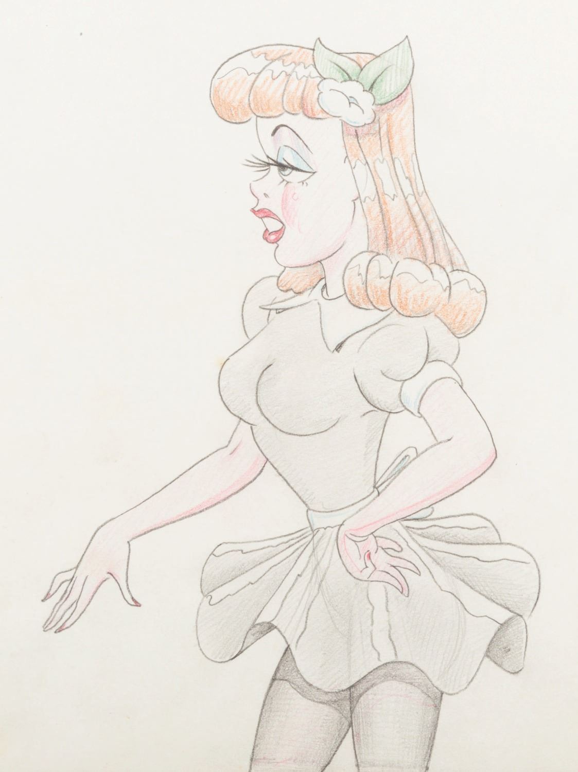 (Schlesinger, 1941) A model drawing of actress Paulette Goddard from the Merrie Melodies short, "Hollywood Steps Out.” Accomplished in graphite and colored pencil, with a character image size of 7" x 4.75" on 9.5” x 12” animation paper, the drawing is in very good condition with light discoloration from age.