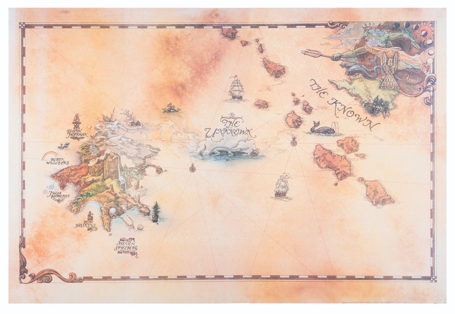 (TriStar, 1991) A large prop map created for the “Hook” teaser trailer. In the trailer, a magnifying glass moves across the map, revealing the names of the lead actors, until it reaches the Lost Boys’ hideout. The map burns in the trailer, so this is an unused hero prop. Measuring 40.75” x 60”, the map displays in very good condition with creases and edge wear.
