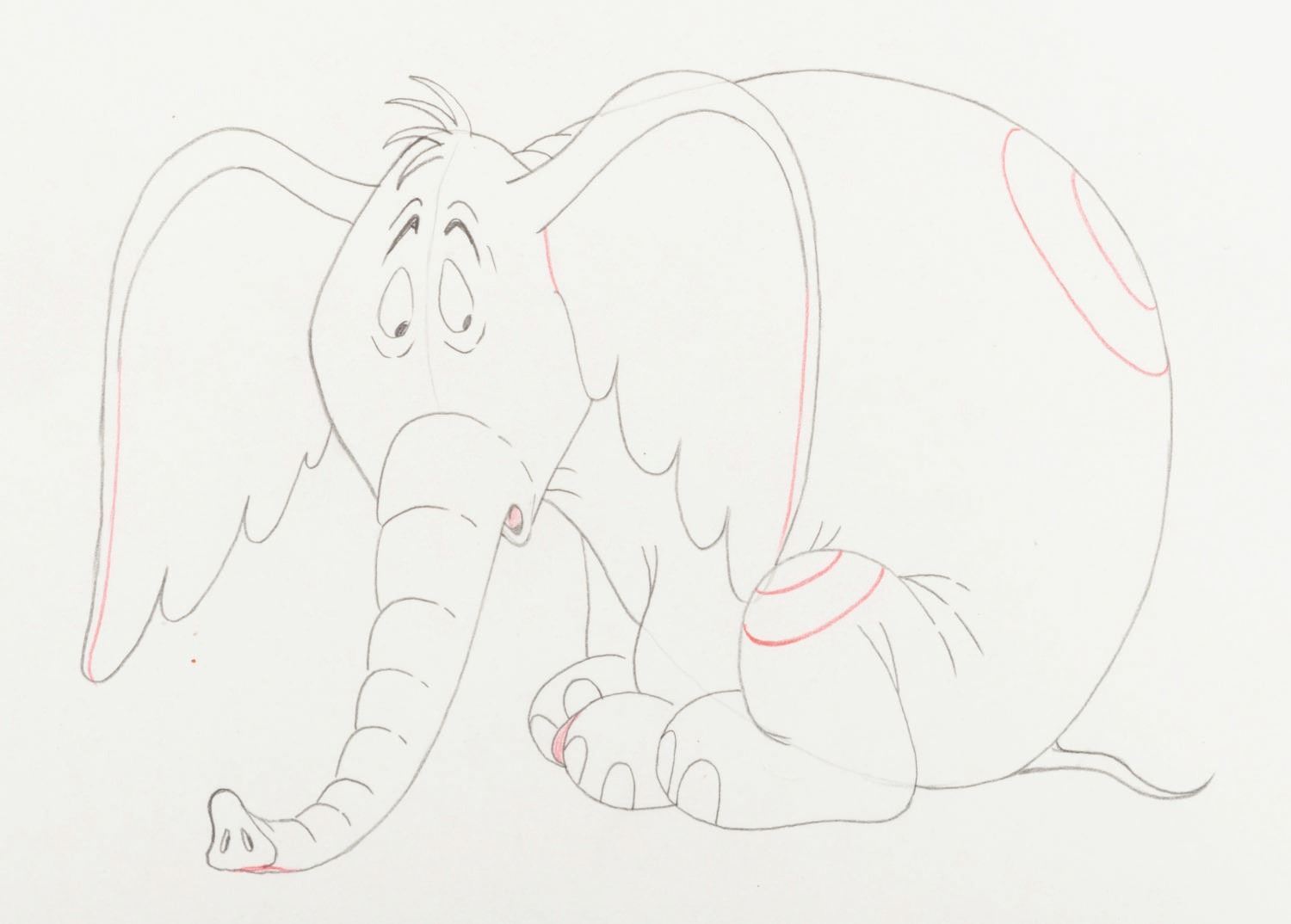 (Schlesinger, 1942) An original production drawing from "Horton Hatches the Egg." With an image size of 7.5” x 5.25” on 9.5” x 12” animation paper, the drawing accomplished in graphite and red pencil is in very good condition with light spots of discoloration and wear.