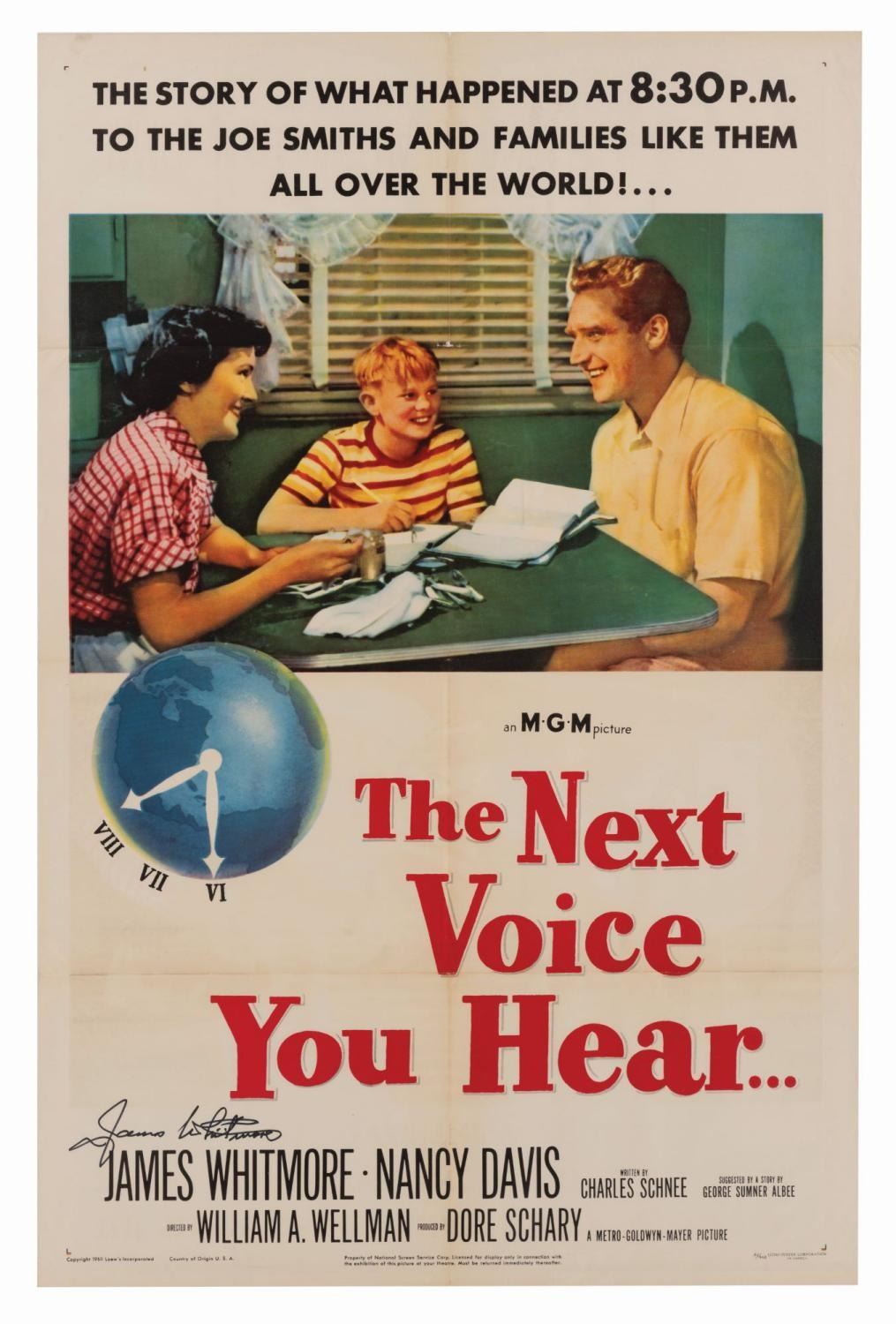 (MGM, 1950) A one-sheet poster for the theatrical release of "The Next Voice You Hear,” signed in ink by James Whitmore. Measuring 27” x 41”, the poster displays in good condition, with typical wear and creases along the original folds, separation at the edge and center fold points ranging from 0.25” to 1”, and light discoloration from age.