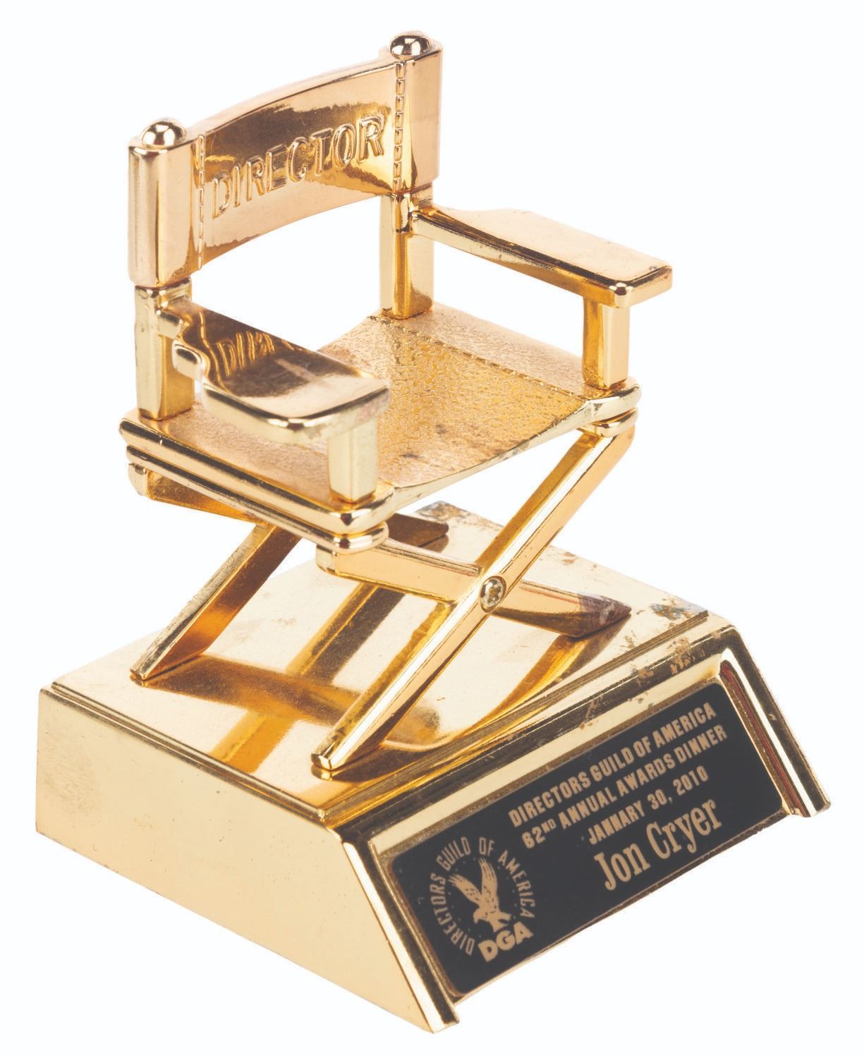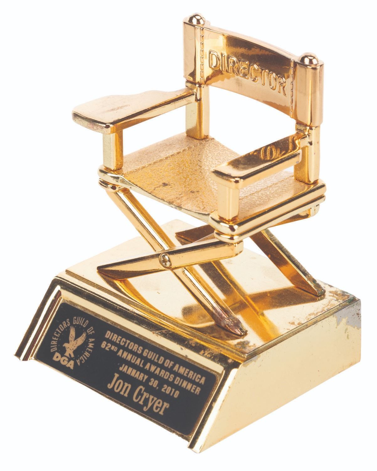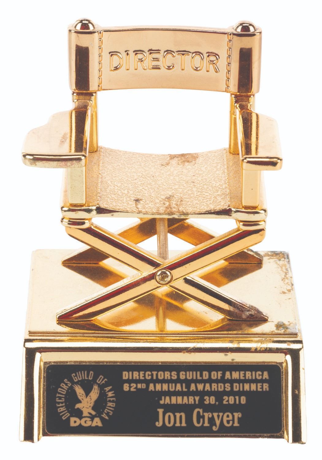 (Warner Bros., 2004/2010) A "Two and a Half Men” costume shirt worn by John Cryer as Alan Harper, and his 2010 Directors Guild of America Award. The shirt appears to be a size large with a tag dated Sept. 2004 bearing Cryer’s initials, and is in very good condition with light soiling. The award measures 2.5” x 3” x 3.75” tall and is in good condition with light stains and tarnishing on the right side.