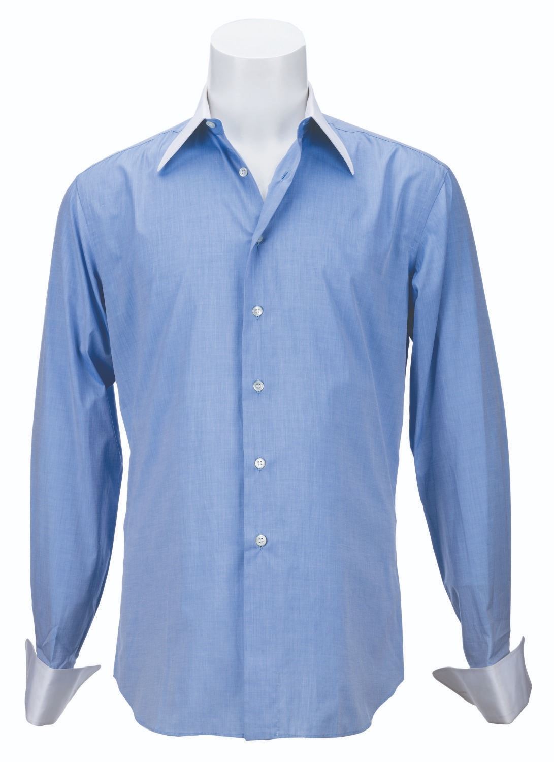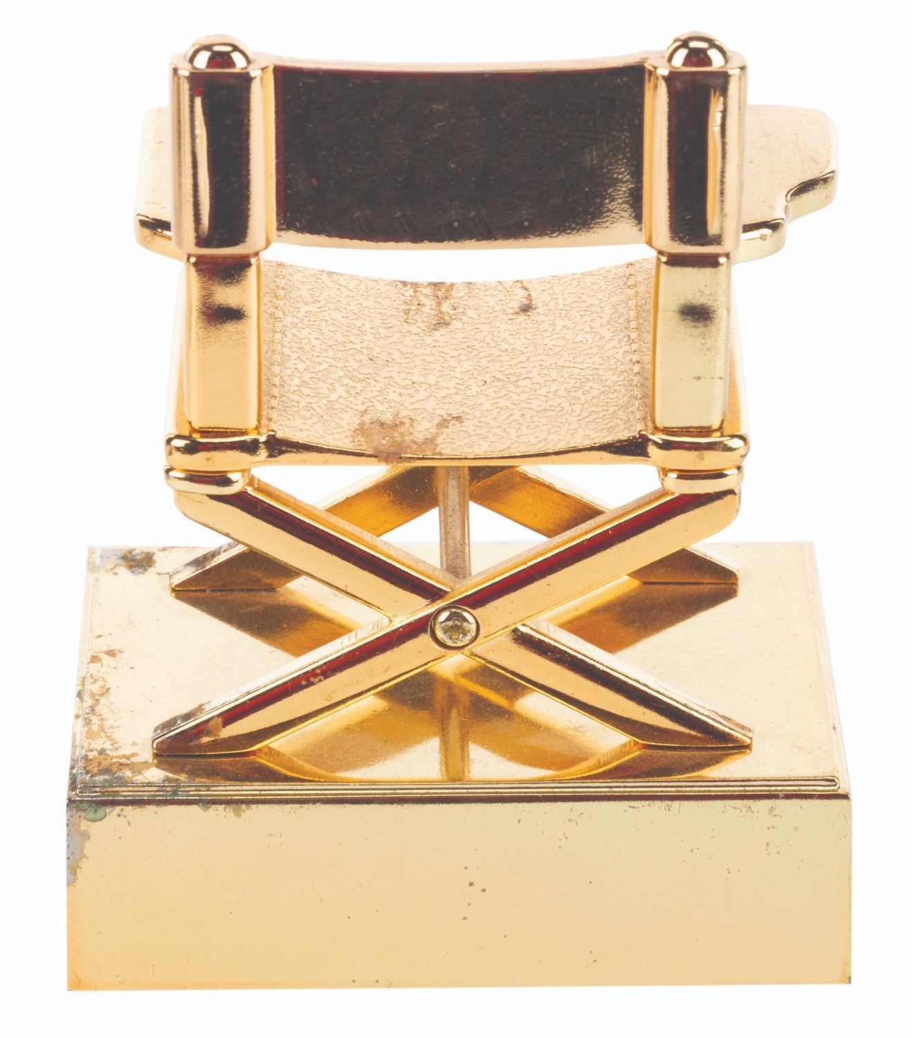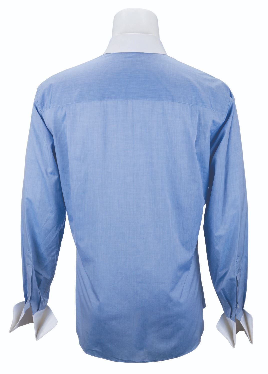(Warner Bros., 2004/2010) A "Two and a Half Men” costume shirt worn by John Cryer as Alan Harper, and his 2010 Directors Guild of America Award. The shirt appears to be a size large with a tag dated Sept. 2004 bearing Cryer’s initials, and is in very good condition with light soiling. The award measures 2.5” x 3” x 3.75” tall and is in good condition with light stains and tarnishing on the right side.