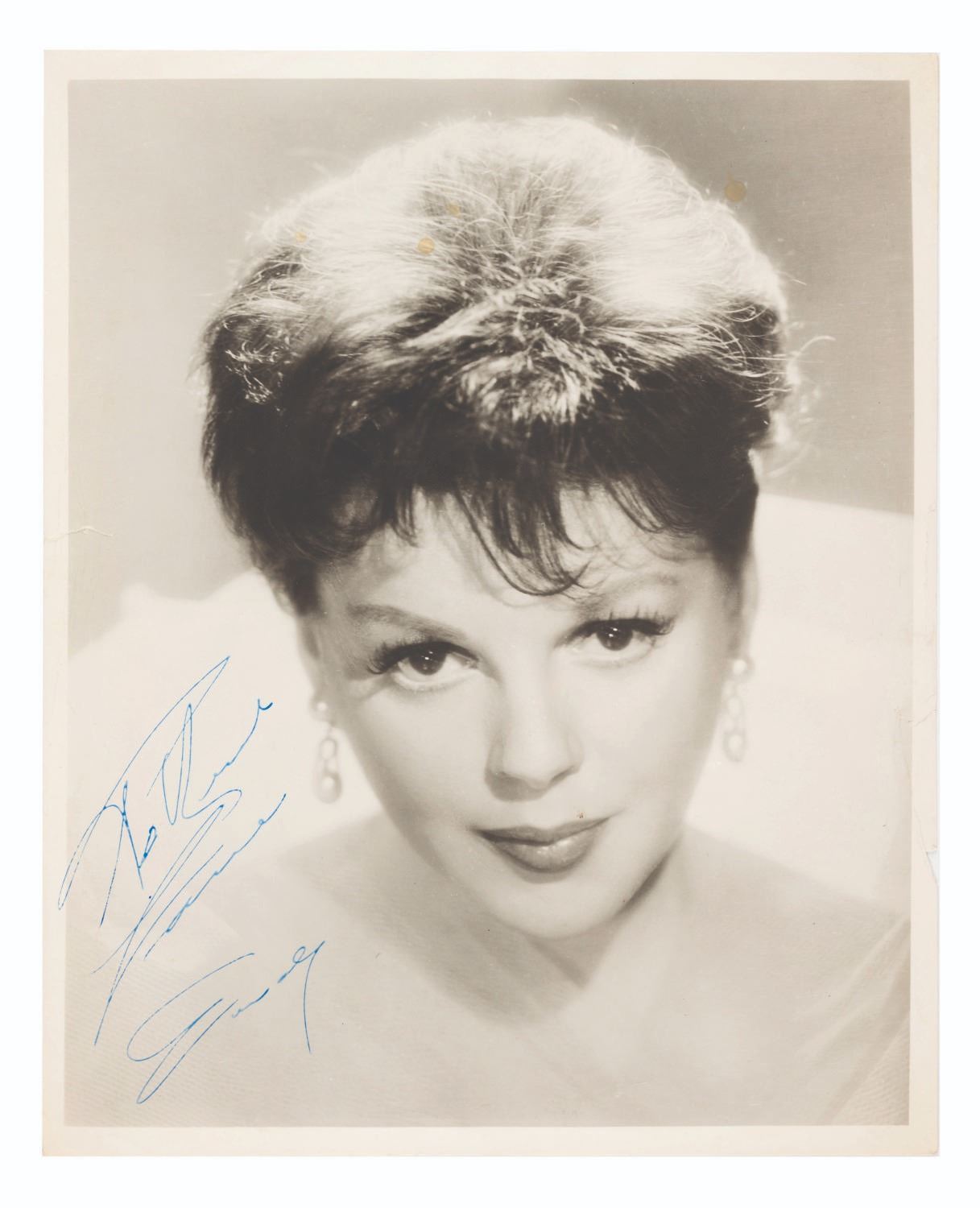 (Judy Garland, 1940s-50s) A glamorous headshot of Judy Garland, signed in blue ink with an inscription. Measuring 8” x 10”, the photo is in fair condition with edge wear, creasing, a 0.5” tear on the left edge, two 0.25” tears on the right edge, light warping, and discoloration from age.