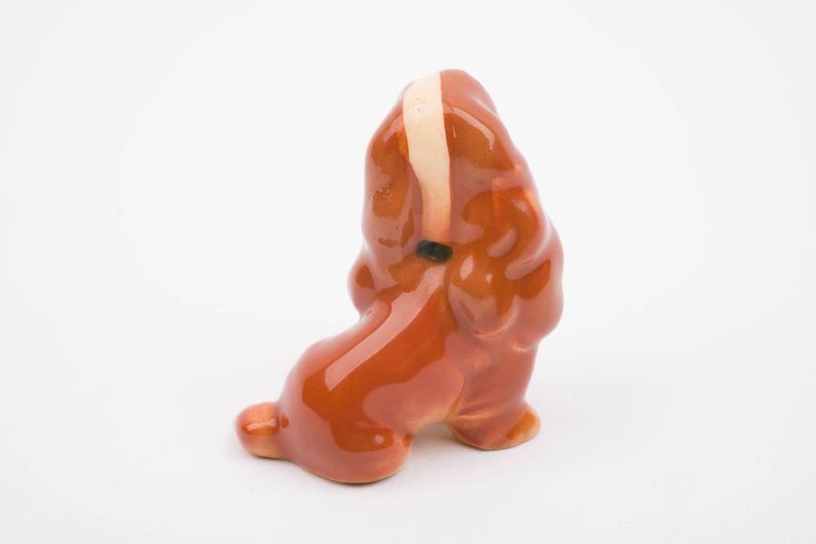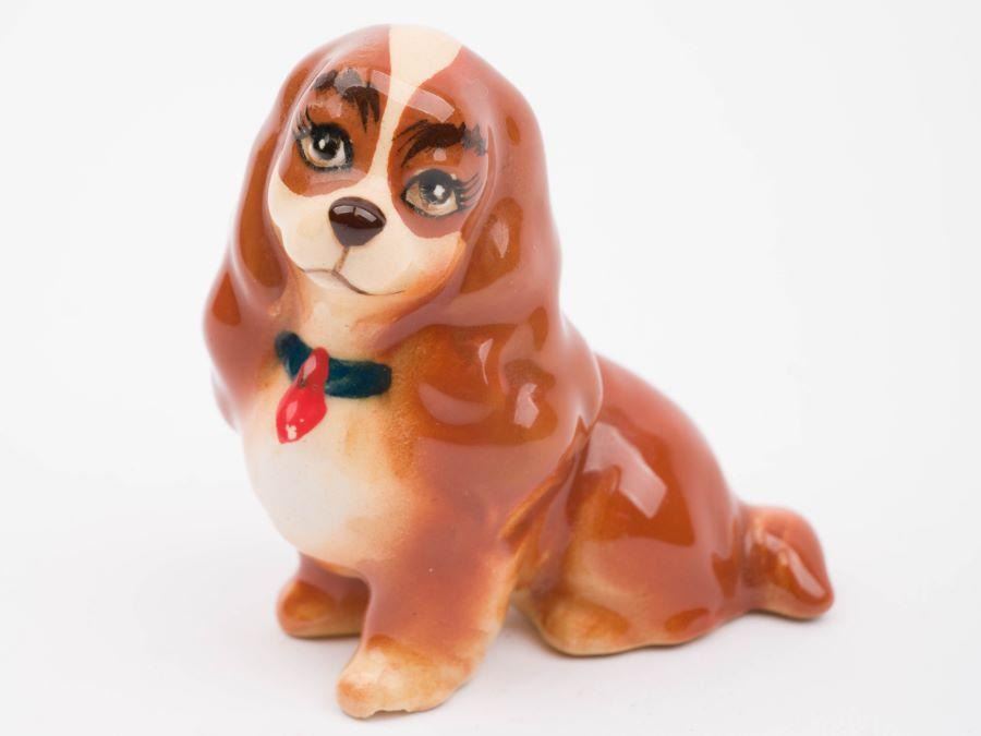 (Disney, 1980s) A ceramic figurine of Lady from "Lady and the Tramp." Measuring 2" x 2" x 2.25" tall, the figurine is in good condition with light paint loss to the collar and a small chip on the bottom of the left front paw.