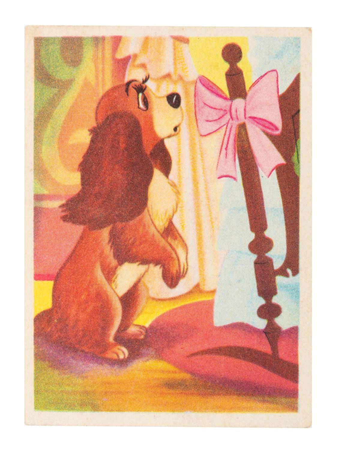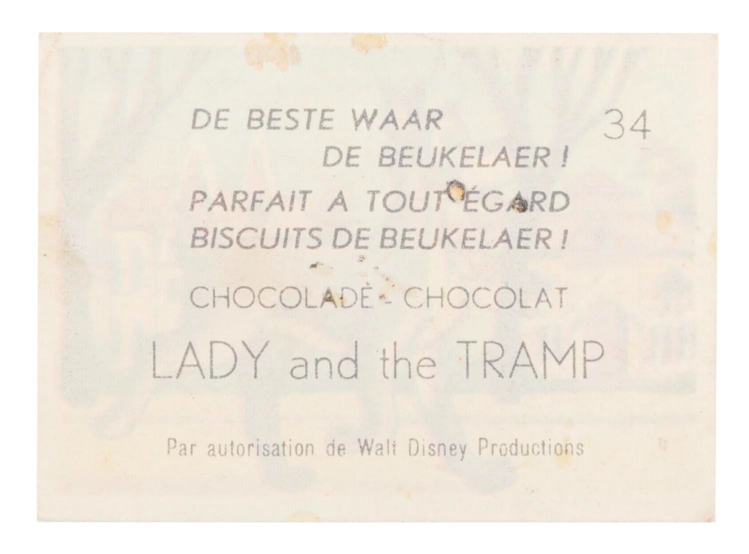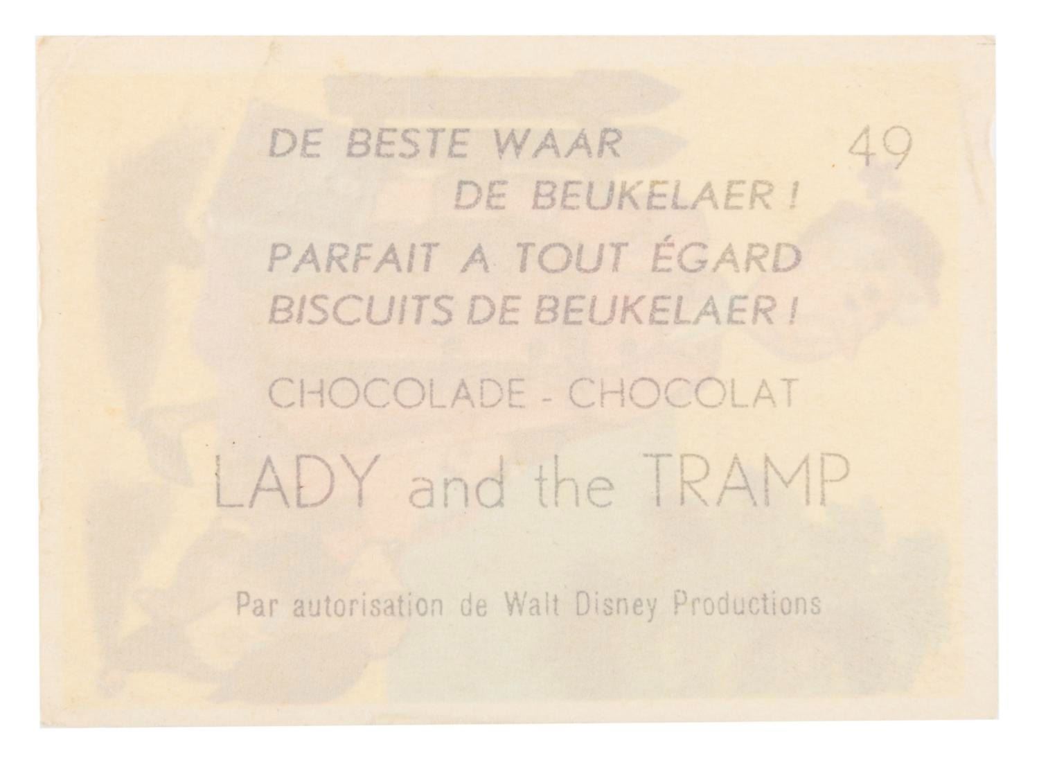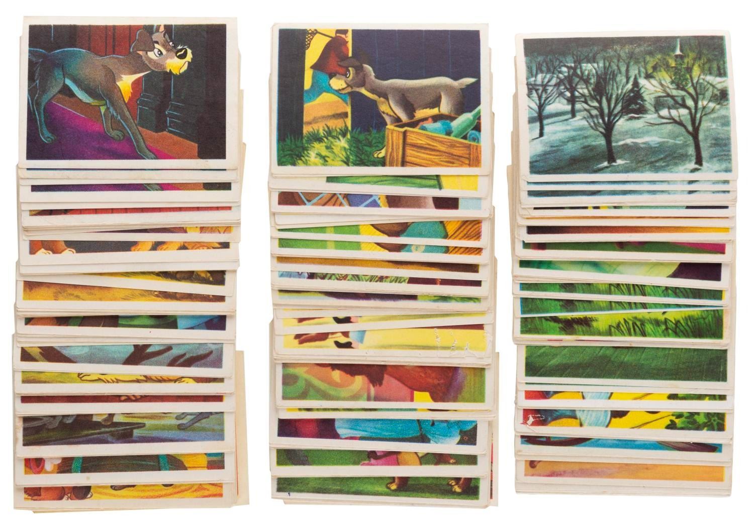 (De Beukelaer, 1950s-70s) A collection of approximately 250 Dutch collector cards from the De Beukelaer biscuit company featuring scenes from "Lady and the Tramp," including many duplicates. Each measuring 2" x 2.75", the cards are in very good condition with typical handling wear.