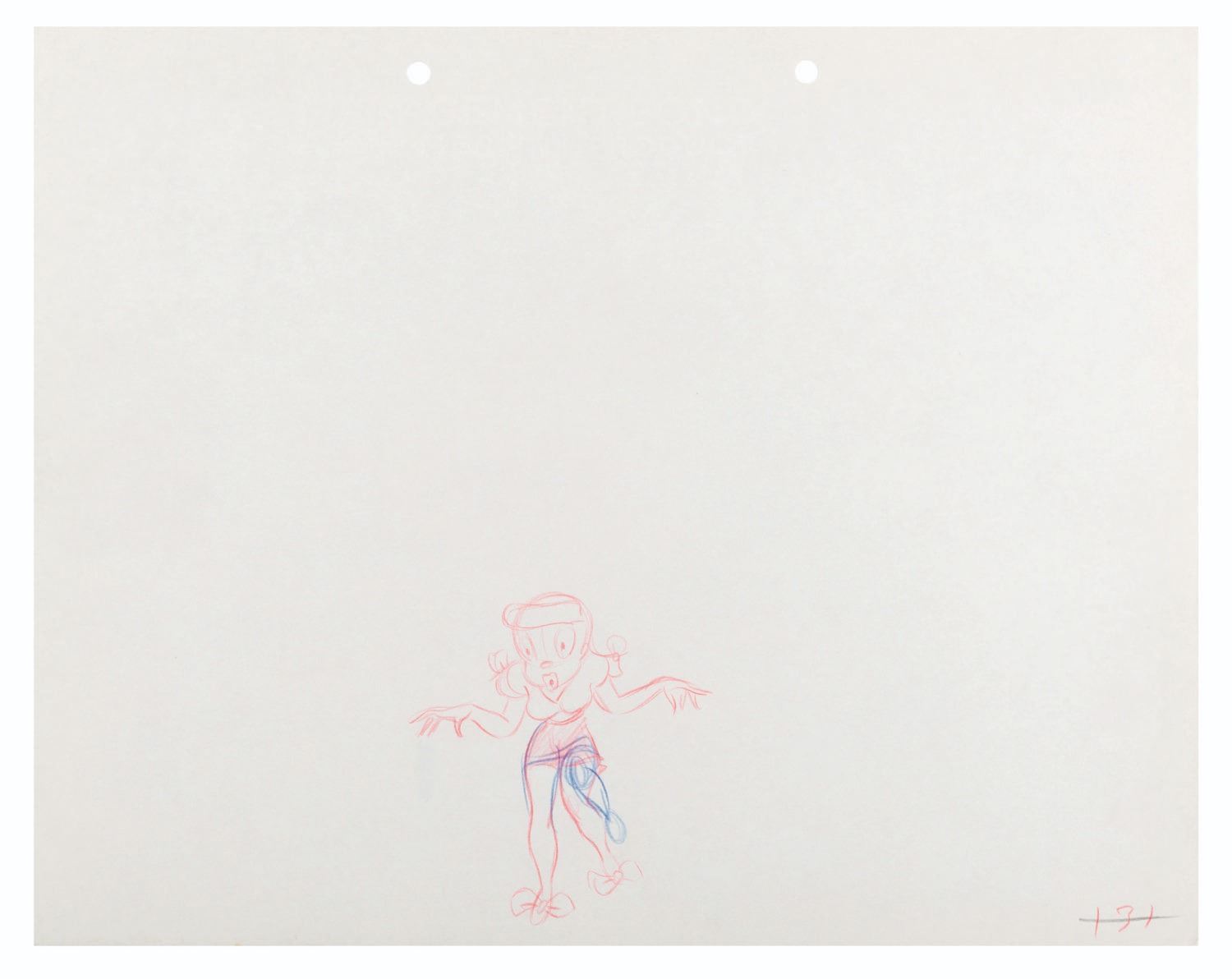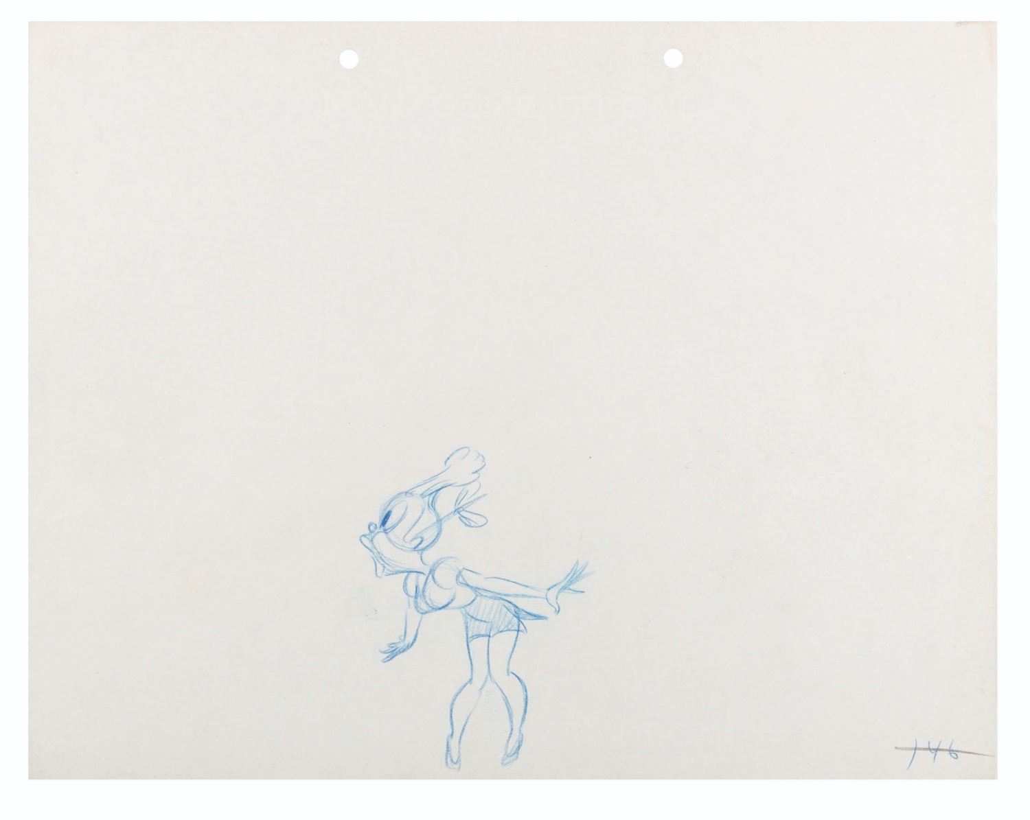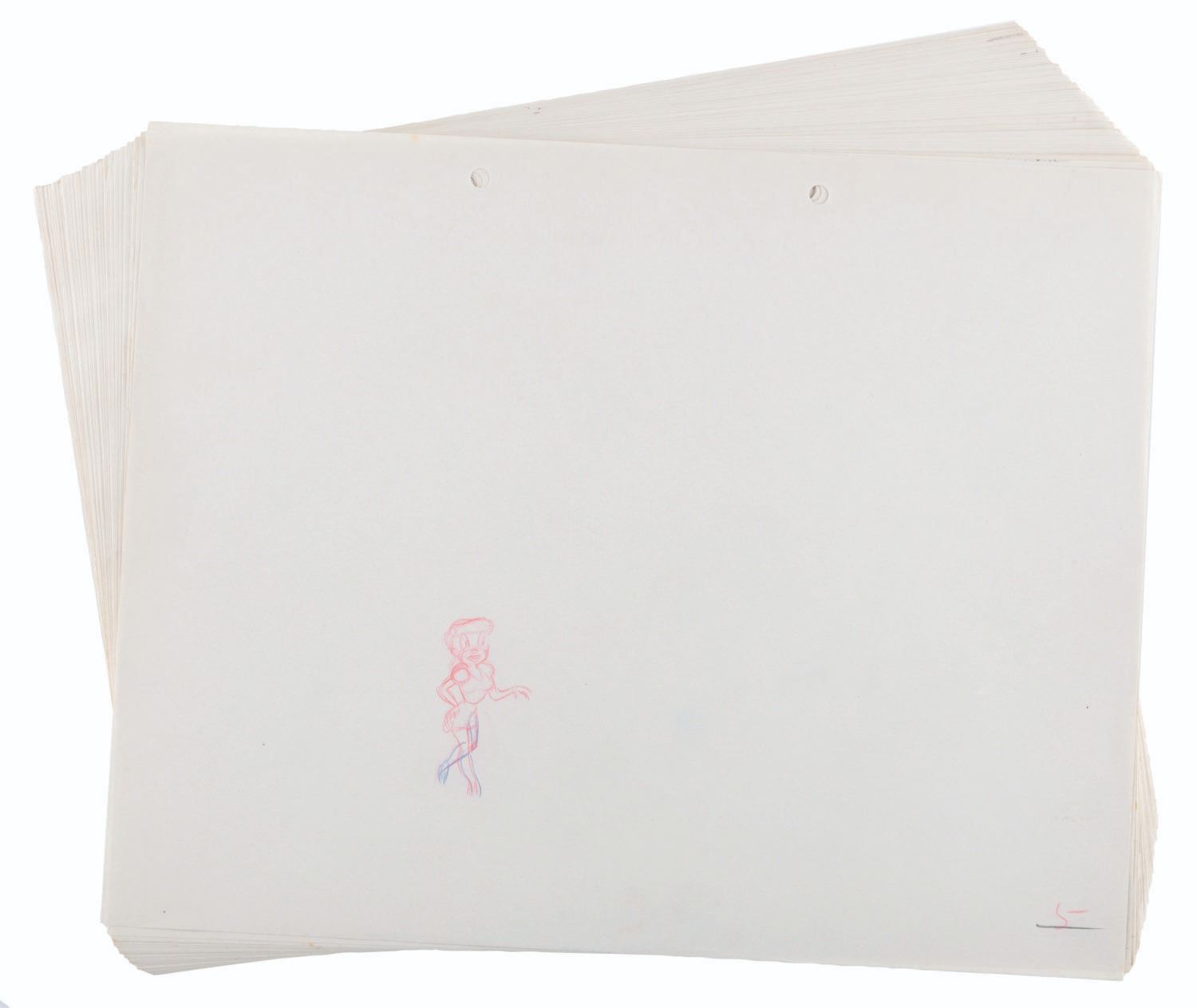 (Schlesinger, 1943) A set of 59 original production drawings from "Coal Black and de Sebben Dwarfs,” from So White’s run through the forest at night. With image sizes from 1” x 2” to 3.25” x 4”, the drawings accomplished in color pencil on 9.5” x 12” animation paper are in very good condition, with expected light wear from production use and age.