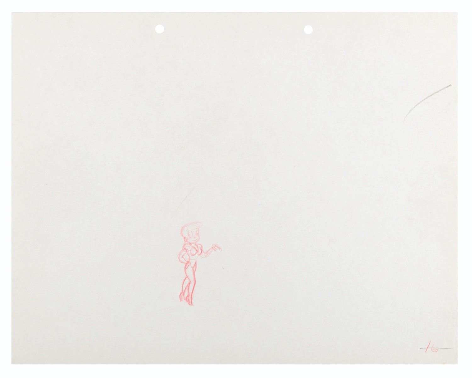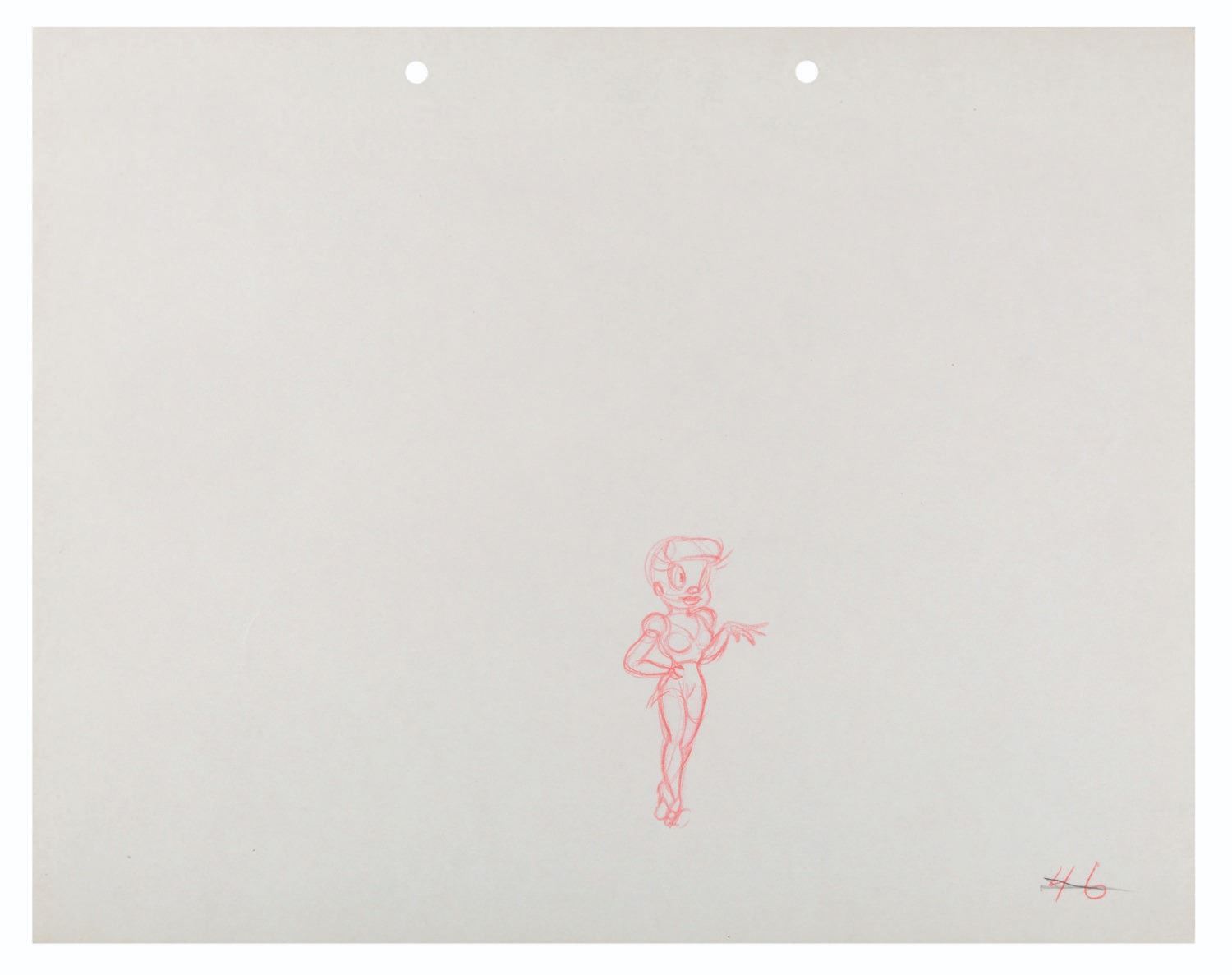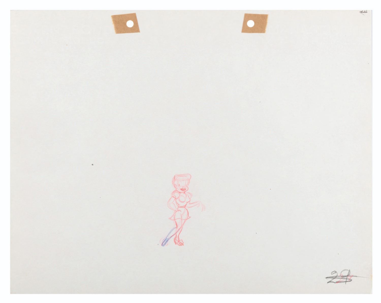 (Schlesinger, 1943) A set of 59 original production drawings from "Coal Black and de Sebben Dwarfs,” from So White’s run through the forest at night. With image sizes from 1” x 2” to 3.25” x 4”, the drawings accomplished in color pencil on 9.5” x 12” animation paper are in very good condition, with expected light wear from production use and age.